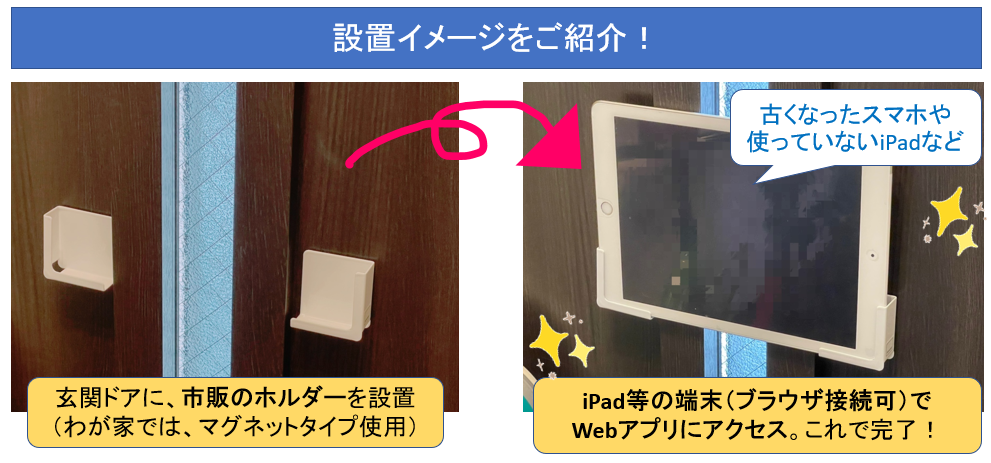 スマホ(iPad)を玄関ドアなどに設置するだけで、手軽に利用ができます。(別途、市販のホルダー等が必要になります。)