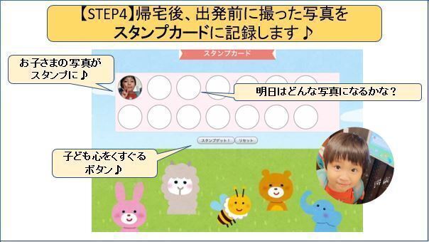 ▶【STEP4】朝、撮った写真を、デジタルのスタンプカードに記録します。帰宅する頃に、アプリが自動的に台紙画面に切り替わります。
