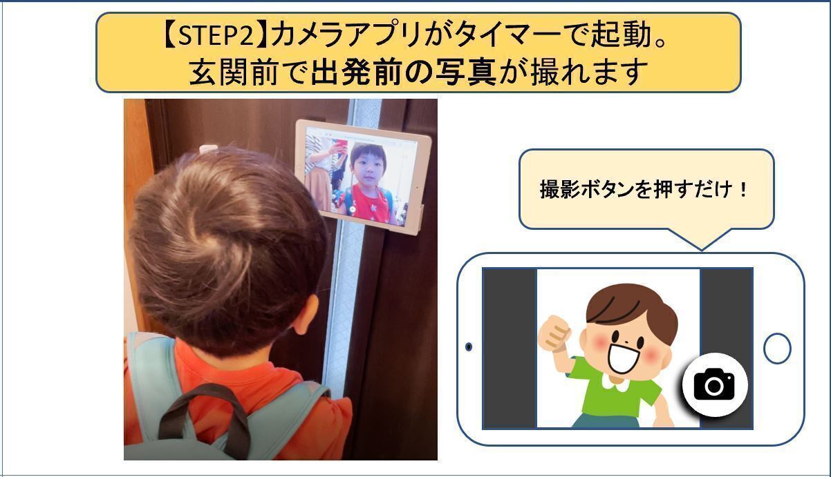 ▶【STEP2】玄関ドアなどに設置したスマホ(iPad)のカメラアプリがタイマーで起動し、ボタンを押すと出発前の写真が撮れます。