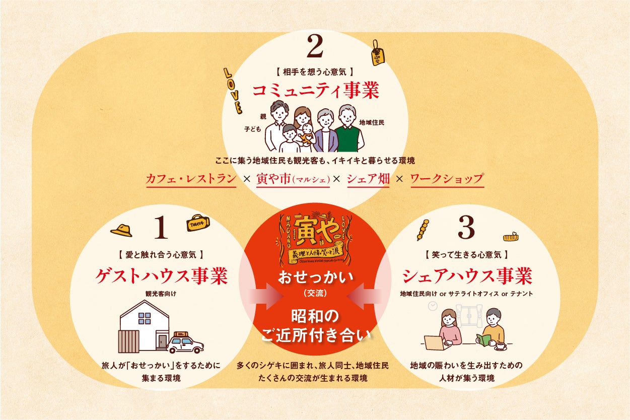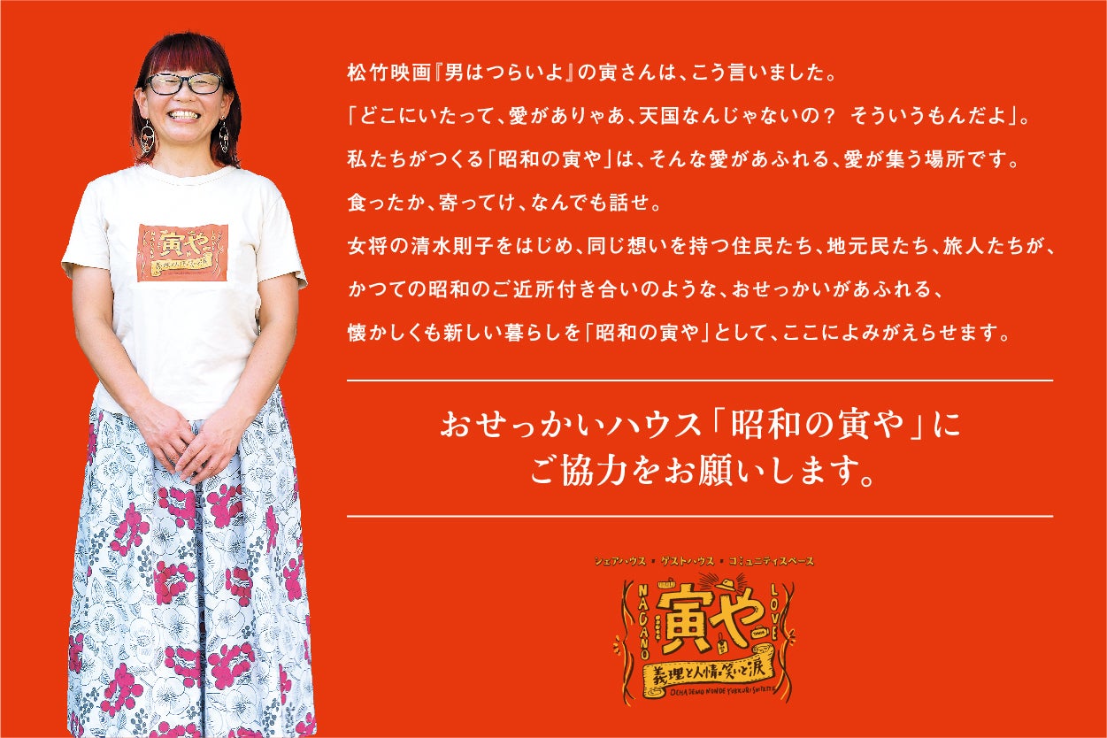 「寅や」を通じて、旅人も、地元の人も、みんながここに来て、人の温もりに触れて「今、幸せだ!」と思ってもらいたい。