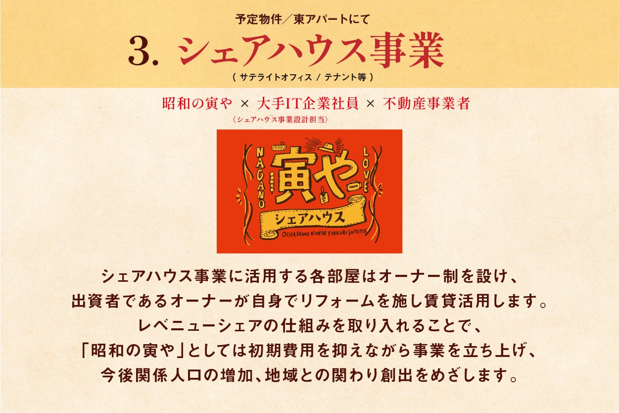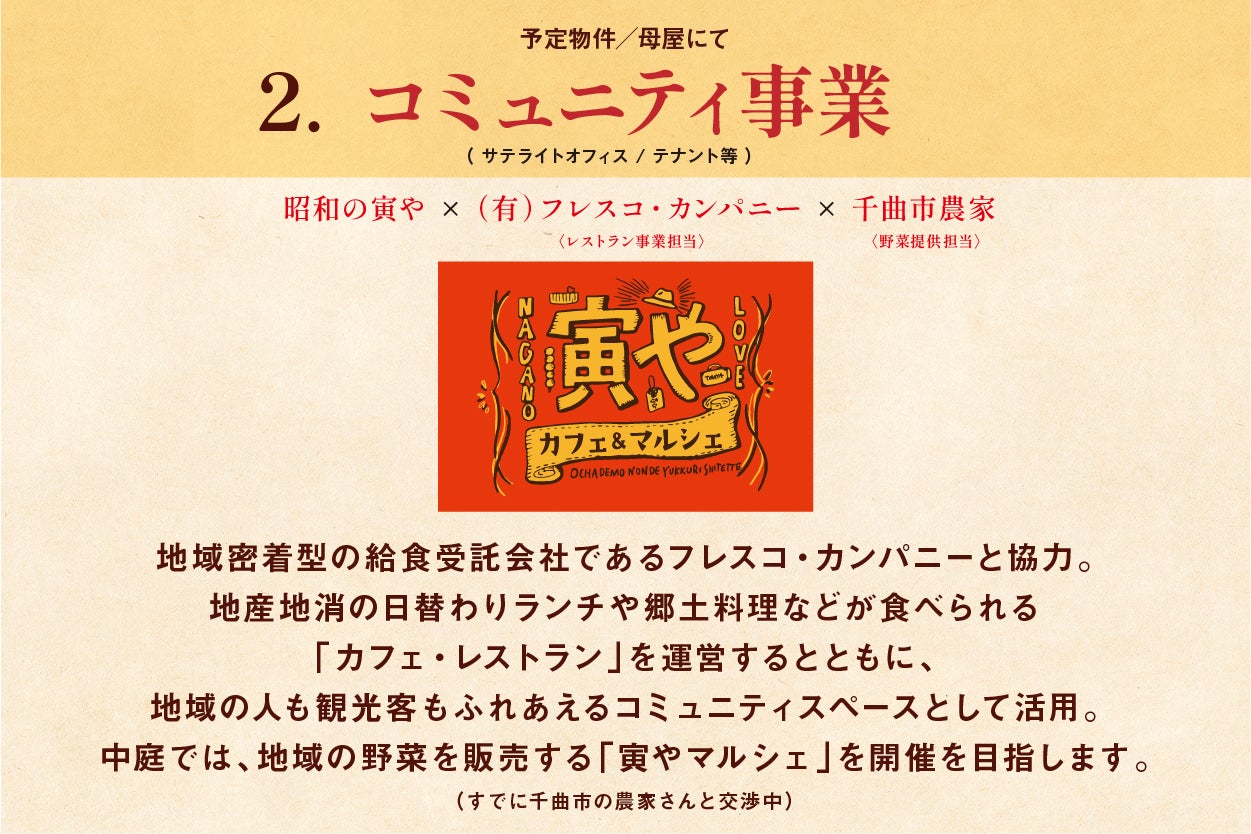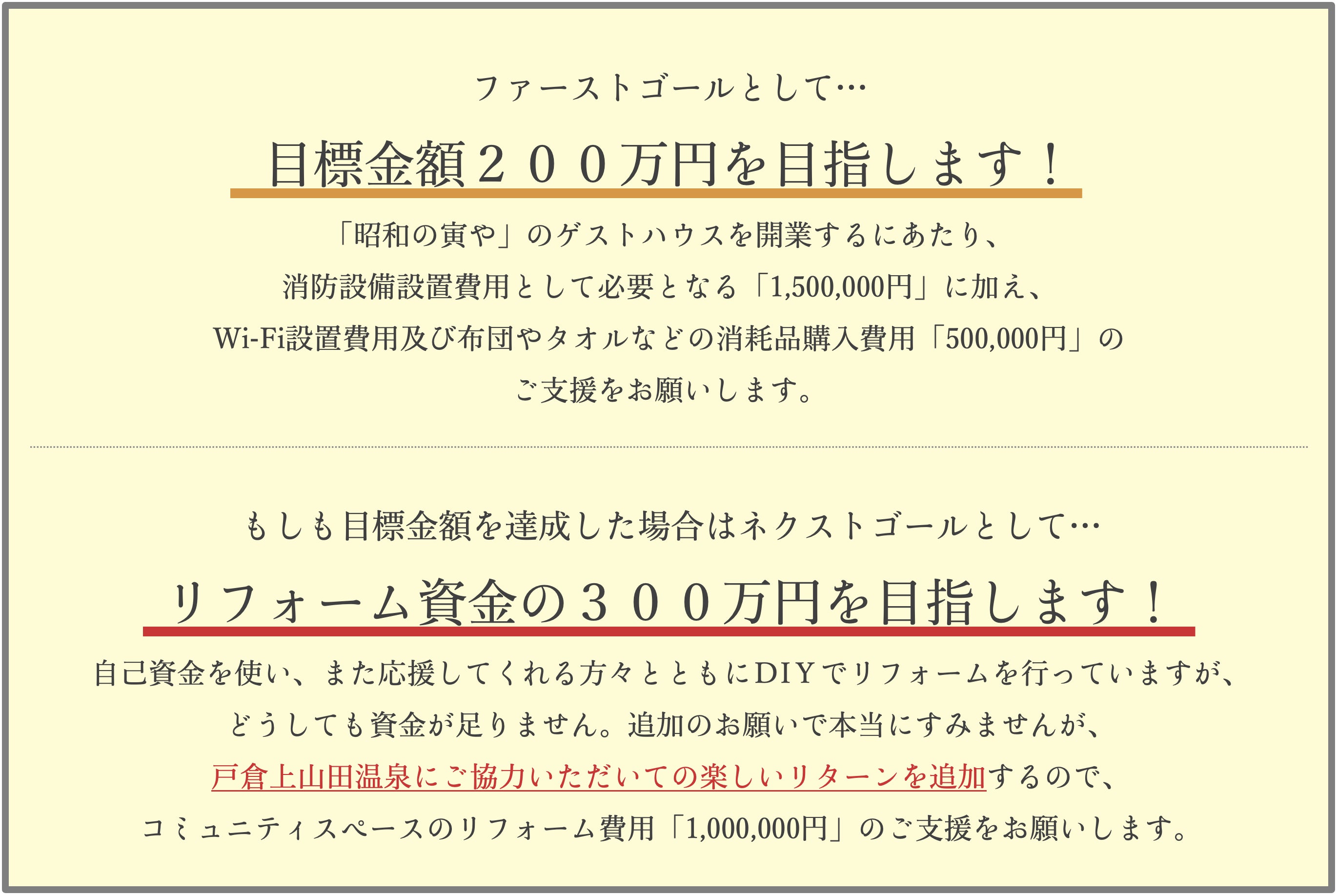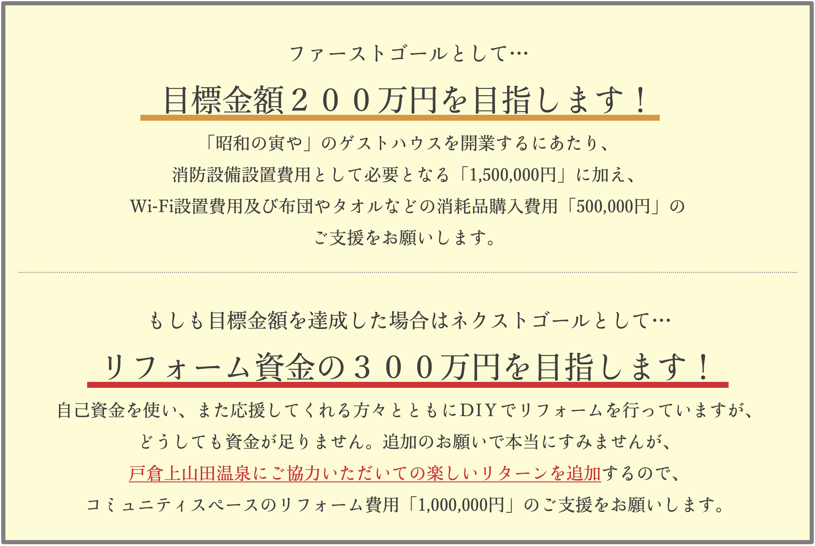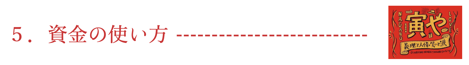 リフォームに必要な全ての費用を、クラウドファンディングで調達することは難しいのですが、足りない費用は地元金融機関様などに融資いただいたり、千曲市の補助金を活用させていただきながら、2022年春の「昭和の寅や」オープンにむけて、全力でリフォームを進めていきます。
