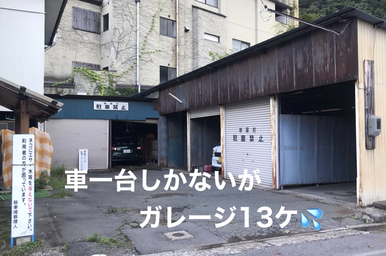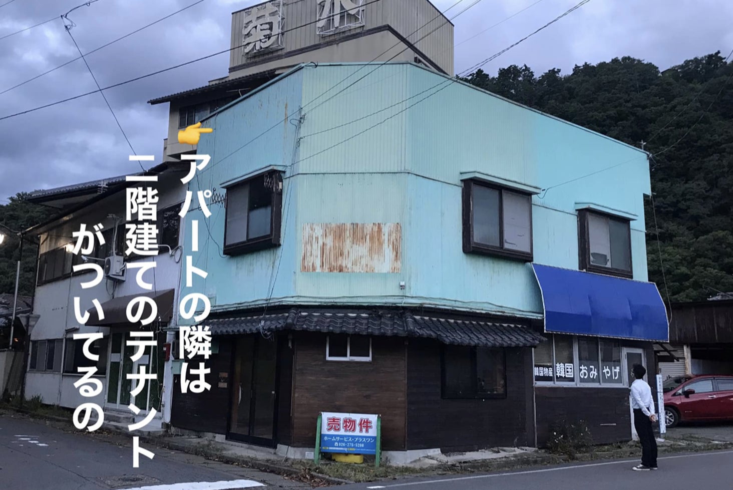 2021年11月、やっと見つけた3軒目は予算500万円に対して1,080万円。戸倉上山田温泉の真ん中あたりにある築52年の2階建て木造ボロアパート。アパート6部屋に、今にも壊れそうなガレージ13棟。