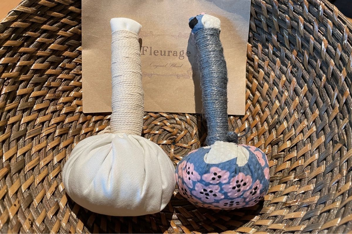 3. 火傷をしない程度に冷ましてから、ハーブが入っている部分を軽くもみ、持ち手を握ってコリのある部分や筋肉の流れに沿ってをマッサージをしていきます。ハーブから出る成分が体に浸透するように優しくマッサージを行うのがコツです。