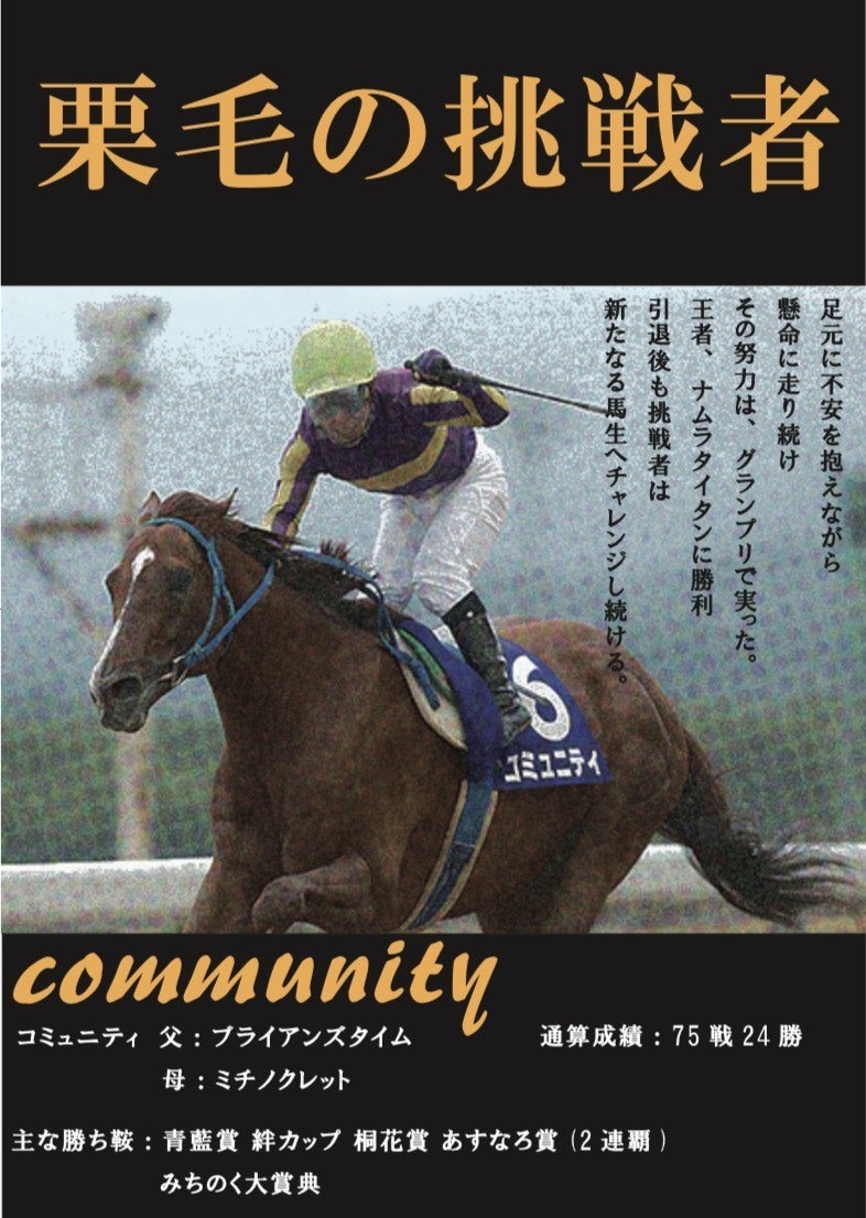 現在、ポスターはサンプル画像でコミュニティのポスター(JRAヒーロー列伝のオマージュ)を使用しています↓下記