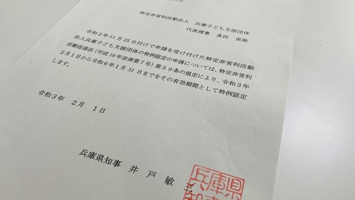 特定非営利活動法人兵庫子ども支援団体は「特例認定NPO法人」として特例認定されています。このプロジェクトへのご寄付は、税制優遇の対象となり、所得税(国税)の計算において「寄付金控除」を受けることができます。控除をお受けいただくためには、確定申告の際に、当団体が発行した「寄付金受領証」(領収書)の提出が必要となります。なお、領収書は基本として2021年分を2022年1〜2月にまとめてお送りいたします。