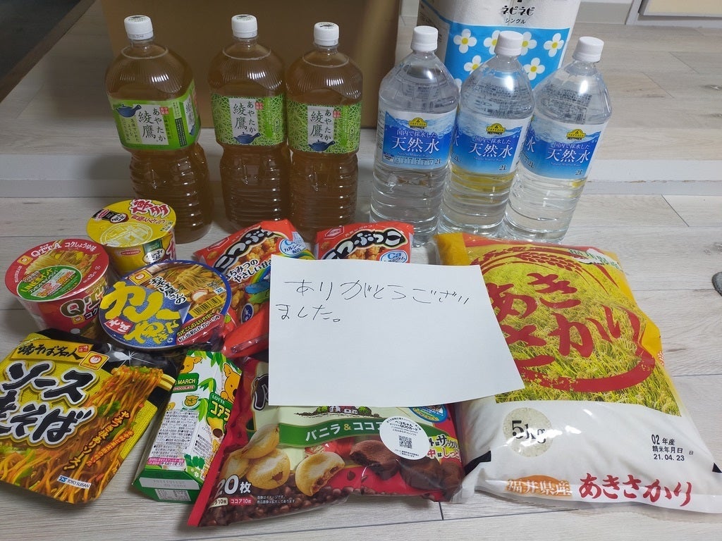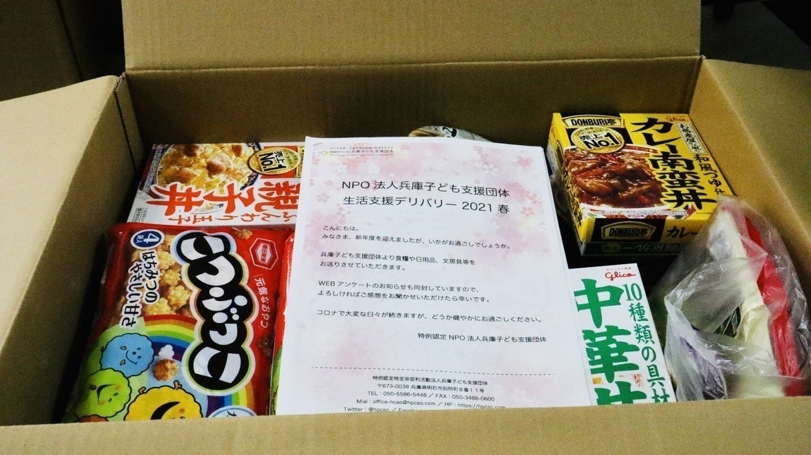 兵庫県が4月にまん延防止重点措置区域に指定された際には、長引くコロナの影響で生活が苦しくなっている家庭が多くなっていると考え、兵庫県内の子育て世帯55世帯に食糧・日用品・文房具を届けました。