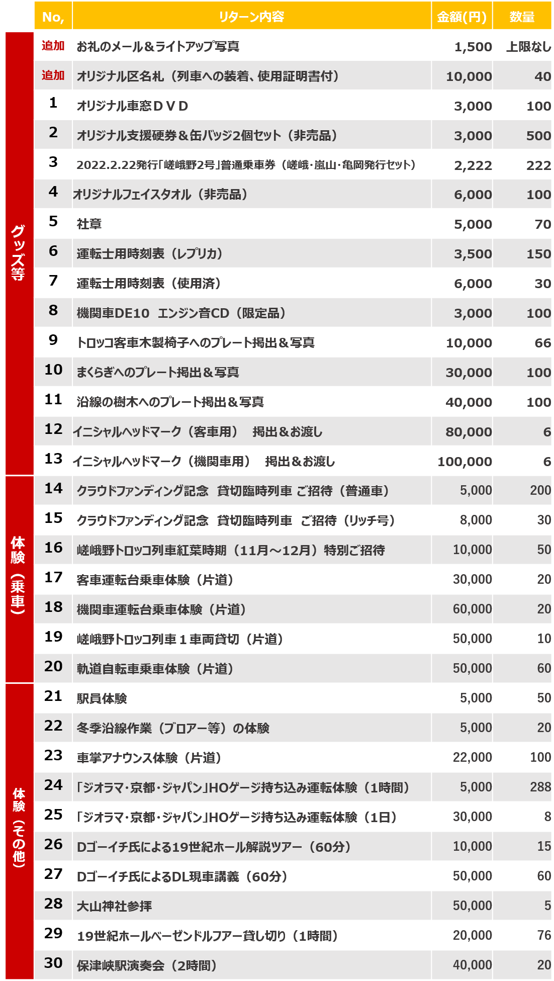 2021/10/05 20:11いつも嵯峨野トロッコ列車を応援いただき、ありがとうございます。10月に入り、体験型のリターンの実施および郵送によるリターンの送付を開始いたしました。お受け取りいただいたご支援者様から、お褒めのお言葉を頂戴することもあり、社員一同、皆様に大変元気をいただいております。本当にありがとうございます。さて、体験型をはじめとしたリターンにつきまして、弊社から内容のご確認や日程調整等のご案内を差し上げておりますが、ご連絡がお取りできないケースが発生しております。恐縮ではございますが、ご登録いただいたメールアドレスおよびCAMPFIREを通じて送付させていただきましたメールにつきまして、今一度ご確認いただきますようお願いいたします。なお、皆様からご支援いただき、着工しておりますライトアップ工事は、現在のところ計画通り進捗しております。引き続き、嵯峨野トロッコ列車をよろしくお願いいたします。 もっと見る