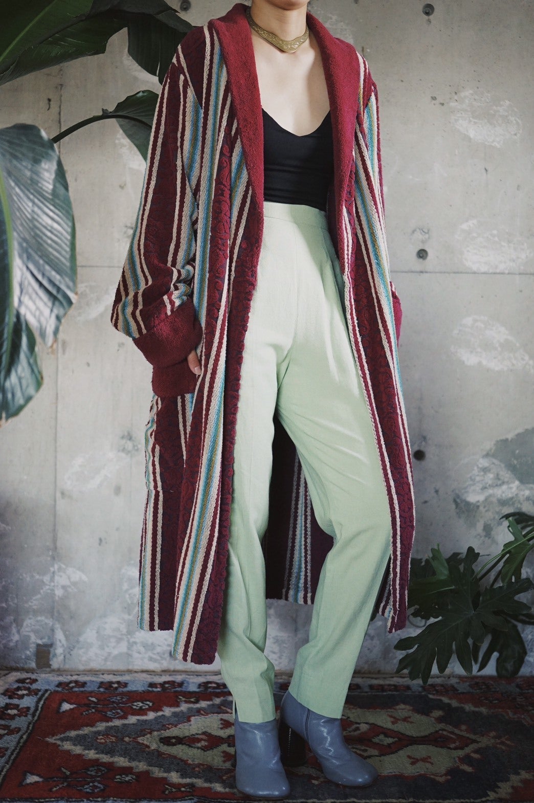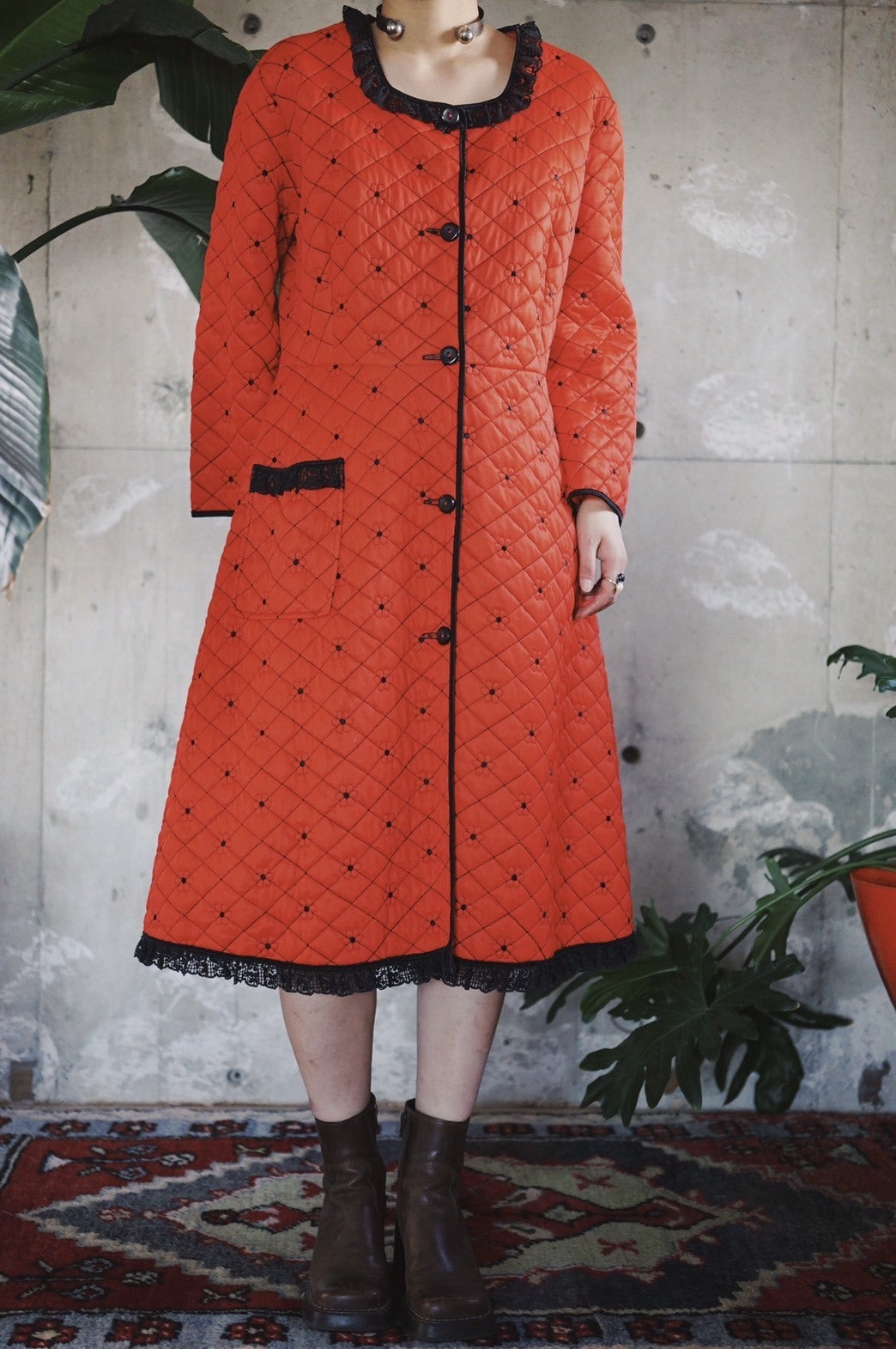 目のさめるようなバーミリオンカラーのキルティングガウン。