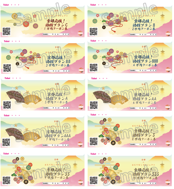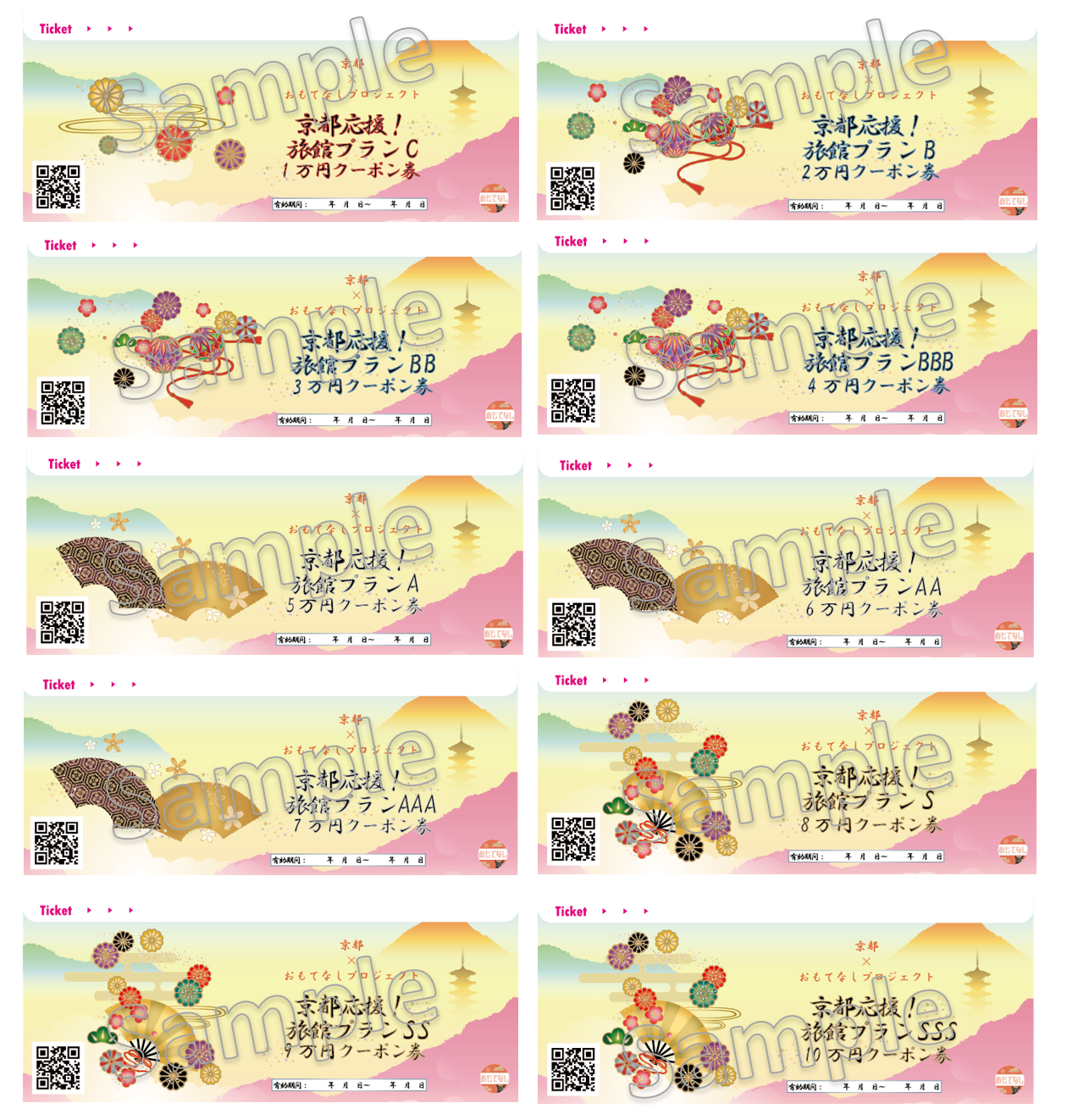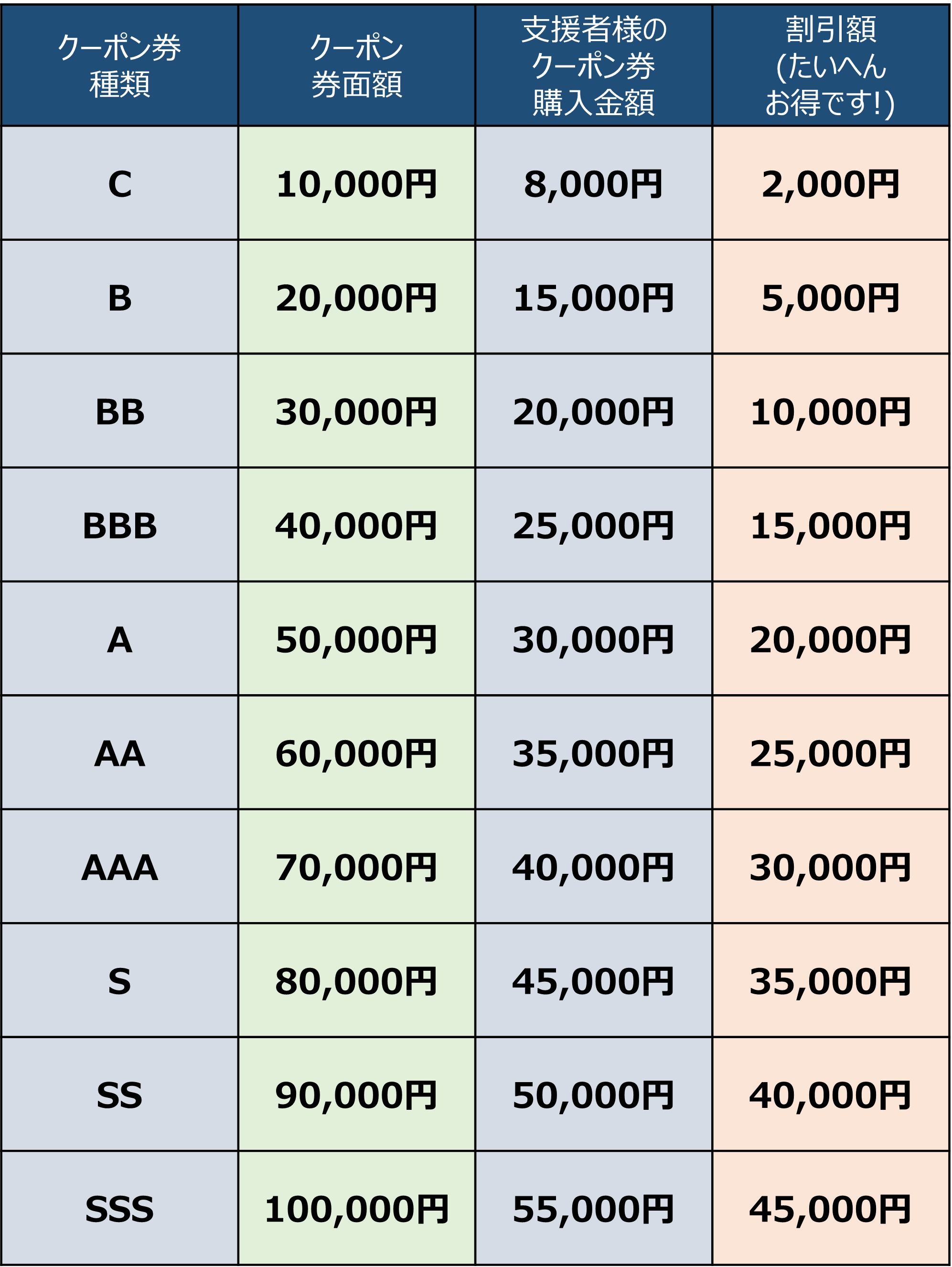 10種類のクーポン券の早見表です。本クラウドファンディングのための価格で、大変お得なクーポン券となっております。一人でも多くの支援者様にクーポン券をご購入いただき、支援先対象旅館様に滞在していただきたいと考えております。是非、ご支援を検討ください。