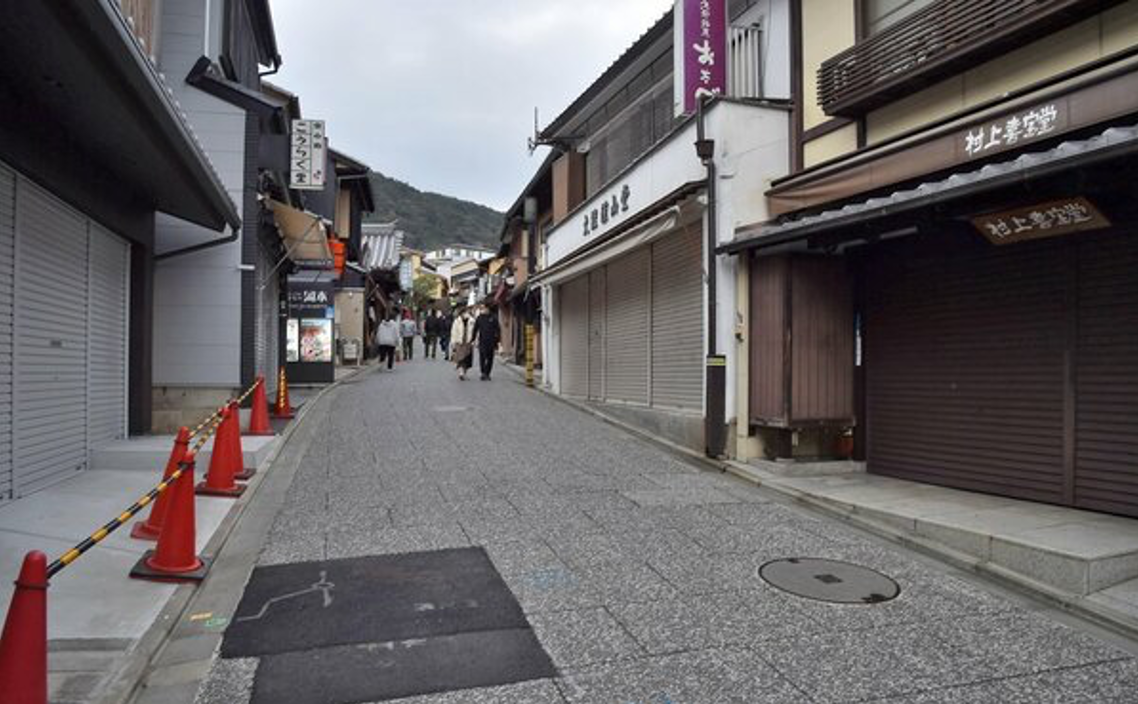 京都新聞(2021年1月23日)より、日曜日にも関わらず人通りが少なく シャッターを閉める店も目立つ清水寺