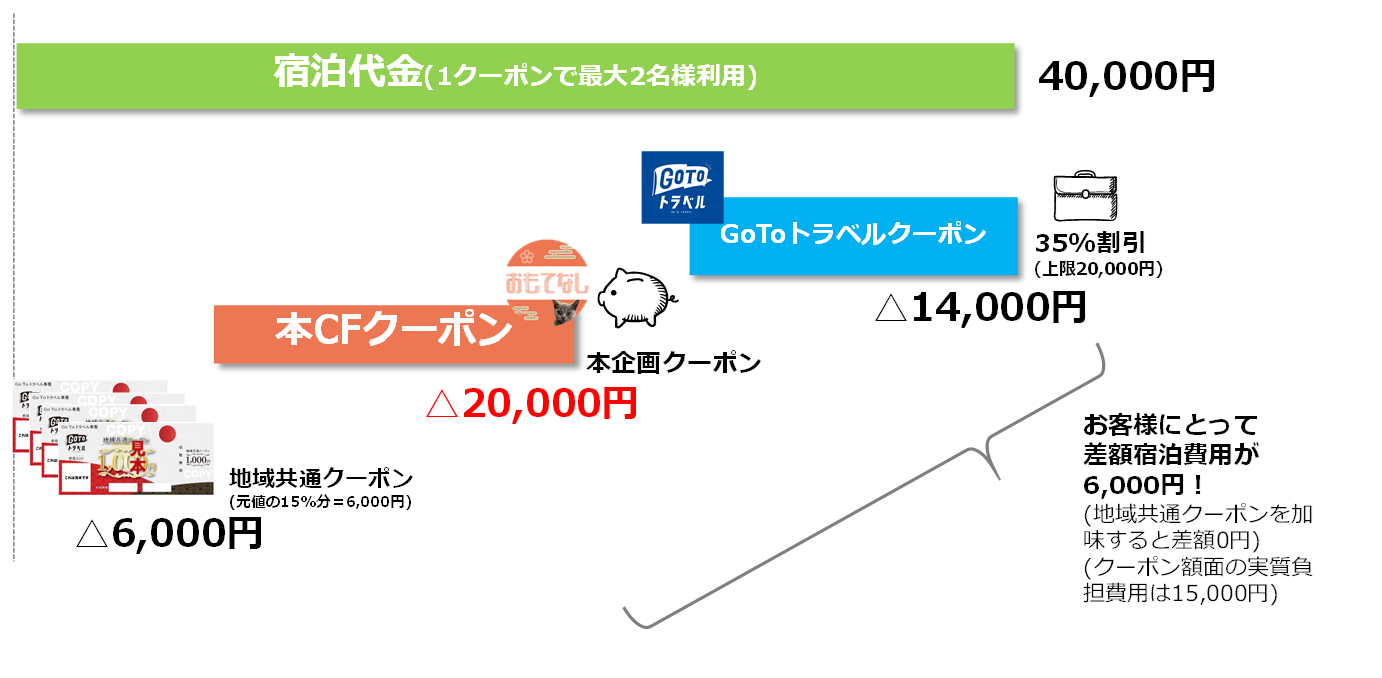 GoToトラベルによる、14,000円(35%)の割引と、地域共通クーポン6,000円(15%)で、差額宿泊費用が実質0円に!