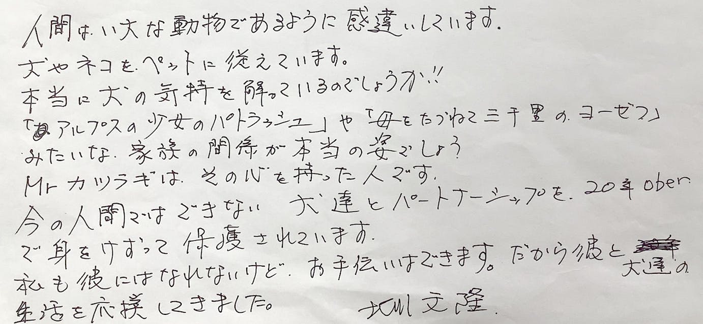 2021/12/10 12:11ご支援者の皆様、今日はお知らせがあります。12月10日をもって、teamkatsuragiは活動を無期限終了することになりました。犬達の飼い主である、葛城さんのご意向です。私達チーム(鈴木あゆ+坂上麻由子)が窓口でいる限り、犬は譲渡に出したくない。今後自分と自分の犬達に関わって欲しくない。これが葛城さんの揺るぎない結論です。犬達の未来の障壁になるのなら私たちがいる意味はありません。クラファン紹介文にも書きましたが、クラファンを立ち上げたきっかけは、私達と葛城さんが友達だったから、それだけです。犬については知識も経験も少ない、保護活動に関してはど素人の親友二人組で「チーム」と名乗りましたが、犬の保護団体さんになるぞと名乗りをあげたつもりも、今後そうなるつもりもありませんでした。ただ、過去5年間、チームメンバーの一人にお金を借りないと生活ができなかった葛城さんと犬達の現状を見て見ぬふりができなくなったので何かできないかと二人であれこれ考え、クラファンを思いつき、立ち上げただけです。これからお話しする内容は、知らなくてもよかったと思われる方もいらっしゃると思います。そこまで詳しく事情を知らなくても良いと思われる方や、長い話は聞きたくないと思われる方もいらっしゃると思います。ですので、全体を4つに分けました。各番号に書かれている内容の要約をお伝えしますので、お知りになりたいと思われる項目だけをお読みくだされば幸いです。1. 葛城さんと私達が話せなくなった理由さて、8月にクラファンが始まって10月に終了するまでの2ヶ月に様々な予測不可能なドラマがありました。人には誰しも触れられたくないことがあります。葛城さんにとってそれはどうやら犬達の健康や飼育状態について疑問を抱かれたり、口を出されることだったようです。きっかけはとある支援者様から、愛犬がフィラリアで苦しみ、大手術を経て命を救うことができた、という話を聞いたチームメンバーがフィラリアにかかっている犬が数多くいる現状に不安を抱いて、「クラファン資金でフィラリアの薬を買いましょう。」と提案したあたりだったと思います。「里親先でやればいい。」という返事にメンバーは疑問を抱きました。生まれてから一度も首輪をつけたことも、他の人間に対しての免疫もない犬達です。簡単に里親に出せない犬達なのにいとも簡単に「里親がやればいい」というのは無責任なのでは?と言ったメンバーに対して、怒号が返ってきました。「俺の決めることを黙ってハイってきいとけばいいんだよ!返事はハイ!それだけ!」8月末のことでした。長い親交期間で初めての怒鳴り声も衝撃でしたが、これまでフラットで対等だったはずの友人関係がいきなり「俺がボスだから従え」とでも言わんばかりの主従関係を主張されたことも衝撃でした。結果、チームメンバーは深い心の傷を負うことになりました。とりわけ、過去5年間、葛城さんが同チームメンバーにお金を借りに来ていたという事実や、クラファンをチームで準備したり、クラファンを宣伝するためにプライベートの時間をすべて注ぎ込んでいたという当時の現状もありました。この後も何度か怒鳴られたことが原因で、メンバーは葛城さんと直接話すこと、電話することができなくなりました。例えば、ご支援者様から餌が届いたことを知らせる電話をかけなければと思うと、また怒鳴られてしまうかもと手が震えたり、不安で眠れなくなったりと世間で言うPTSDのような症状が起きてきたのです。9月中旬のことでした。ただ、まだこの当時のチームは、第三者が来るのであれば、会話をせずに葛城さん宅に行く事はまだできていました。ですが、それすらもできなくなる出来事が起きました。2. 交友関係の終わり10月中旬、譲渡のために佐世保を訪れていた甲斐っとランドさんに挨拶をするためにアポなしで葛城家に行ったメンバーが聞いたのは、耳を疑うようなチームに対する批判でした。「チームは盗人。」また、葛城さん宅を訪れた別の方からも葛城さんがチームについてこう言っていたと聞きました。「お金は人を変える。」その言葉は、最後のやる気すらを打ち砕くのに十分な打撃でしたし、看過できない批判でした。チームメンバーと葛城さんの親交は30年来のものでした。お互いの信頼があったからこそ成立している関係だったはずです。長年の犬の保護活動のことを葛城さんから聞いていた私たちは、葛城さんのことを信じ、尊敬していました。葛城さんにとっては、メンバーは継続的にお金を無心してもいいと思うほど親しい相手であったはずです。「葛城さん、またお金かしてってきたよ。私しかいないんだって」過去5年間、週1から月1のペースでお金を無心にきていた葛城さんと、それがストレスだとこぼしていた親友。「犬を助ける活動のための借金だから。素晴らしい人だから」と信じて、そこから現状を解決するためにと2人でクラフ