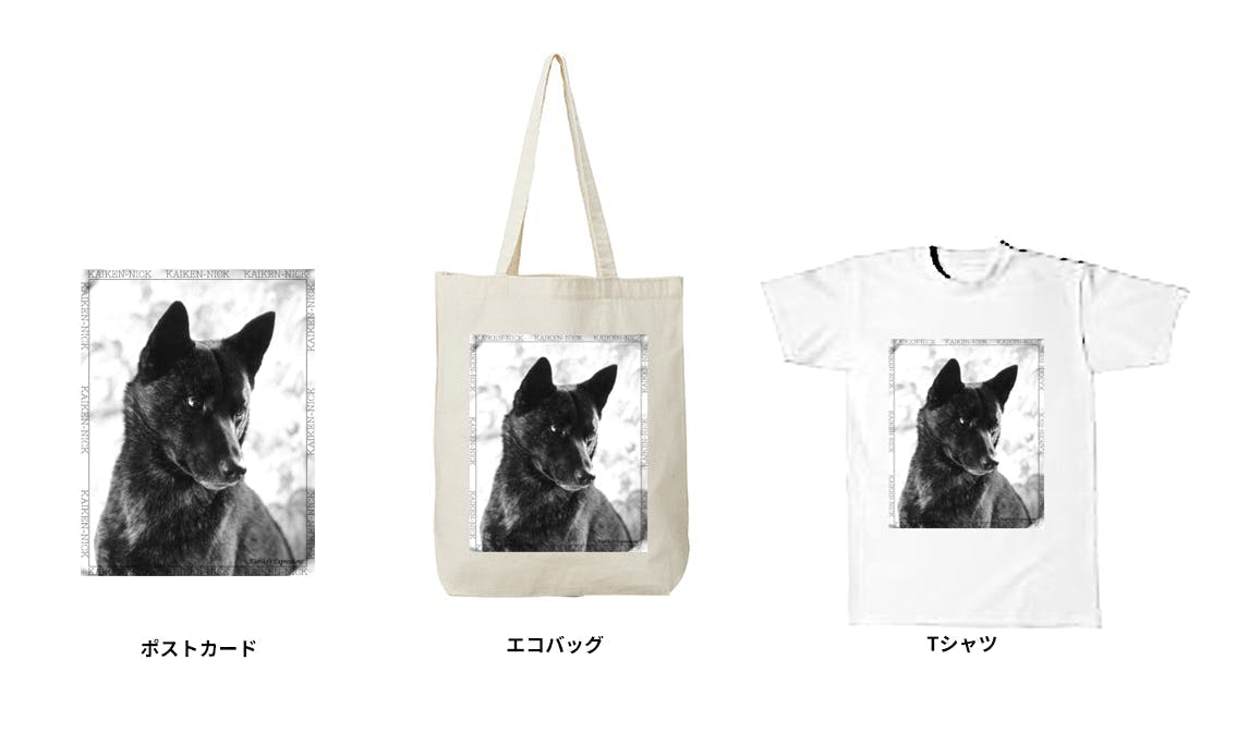 葛城さんが最初に保護活動を行うきっかけになった甲斐犬ニック(飼い主に虐待を受けたのちに山に捨てられた)の写真デザインを施したグッズになります。