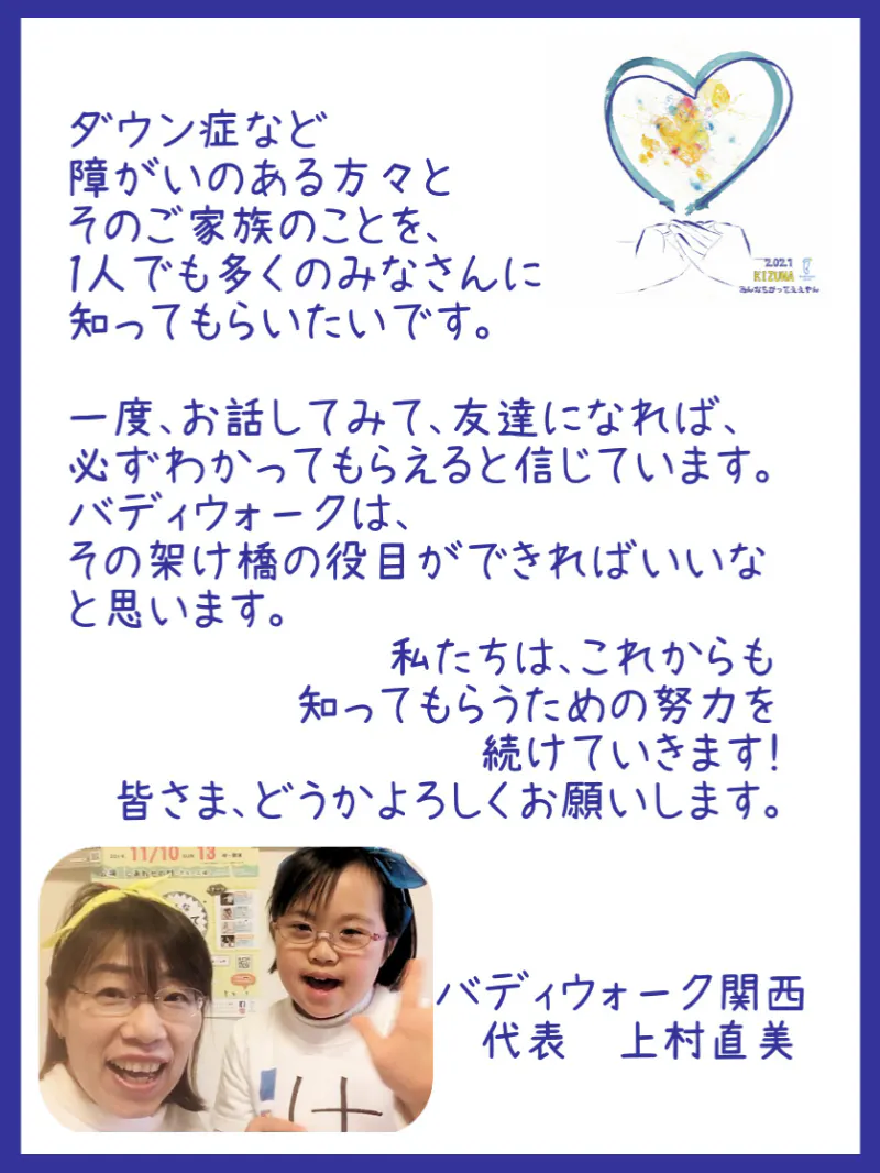 私たちはバディウォークを通して、多くの方々にダウン症についての理解を深めていただき、あらゆる人が、共に生きる社会となる事を願っています。