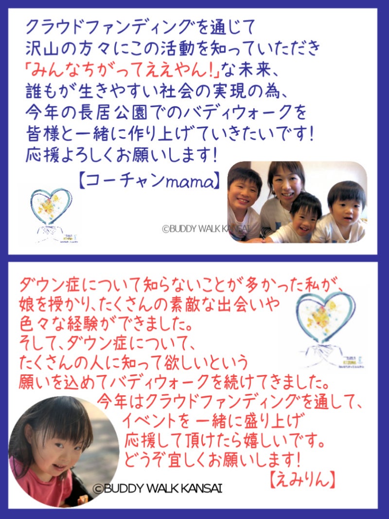 私たちはバディウォークを通して、多くの方々にダウン症についての理解を深めていただき、あらゆる人が、共に生きる社会となる事を願っています。