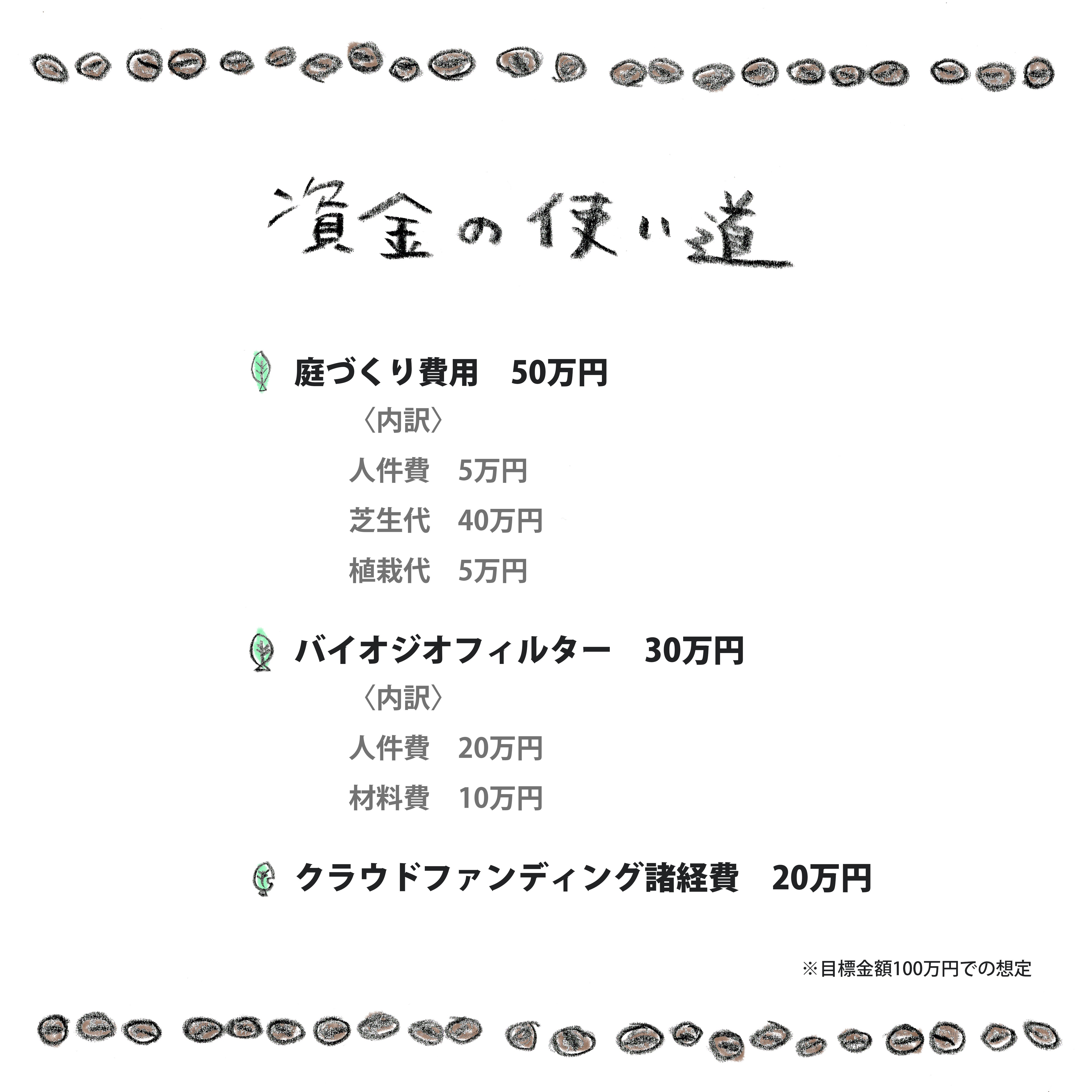 支援金の使い道は、「庭づくり」と「バイオジオフィルター」の費用にあて、大切に使わせていただければと思います。