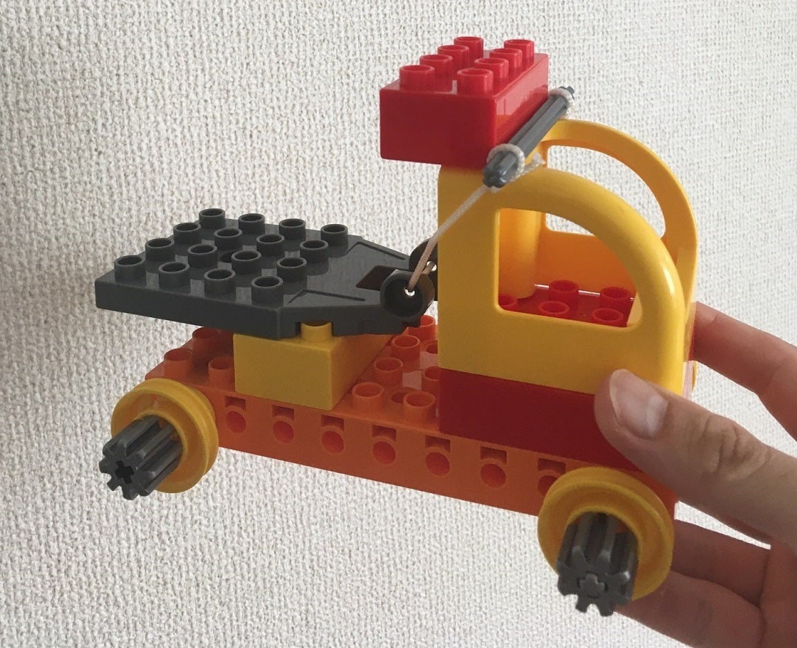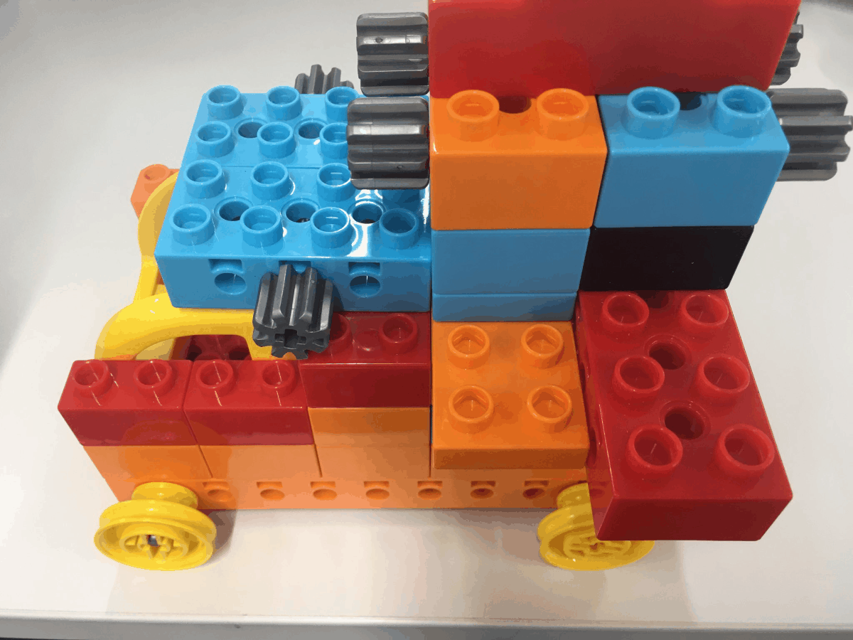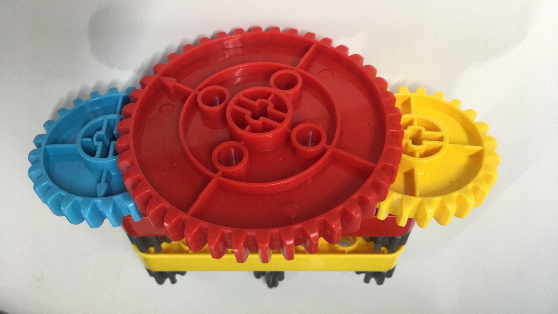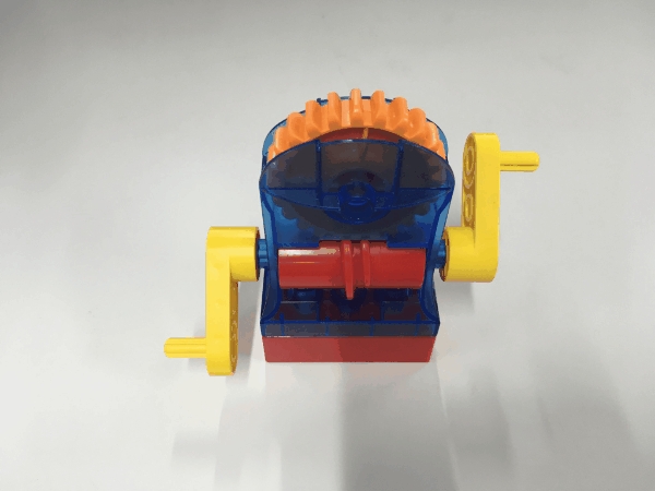 見た目はかわいらしいですが、これはいったいなんなのでしょう?ギヤが3つ使われていますが、かみ合っていないので意味はありません。作成者の7歳児に聞いてみたところ、