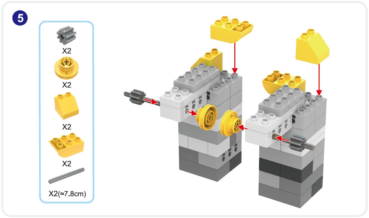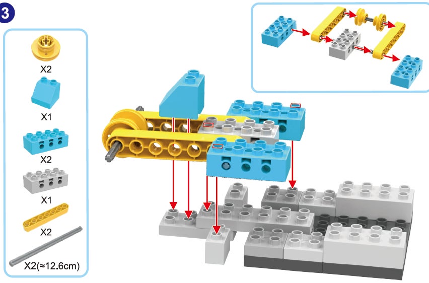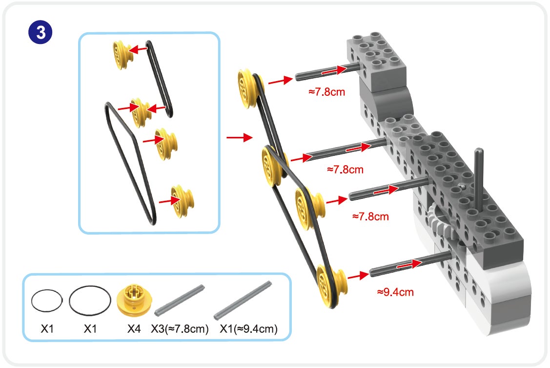 他のブロック同様に自由な発想で組み立てることも出来ますが、まずは説明書を見ながらいくつか作ってみてください。例えば下図の組み立て。プーリーに輪ゴムを通すのですが、軸と輪ゴムとプーリーの組立順を間違えるとゴムがかけられなくなります。ちょっと考えればわかることなのですが、夢中になって組み立てていると、大人でも見落とすもの。繰り返すうちに、失敗が体感となって身に付き、先を見通す力が養われます。