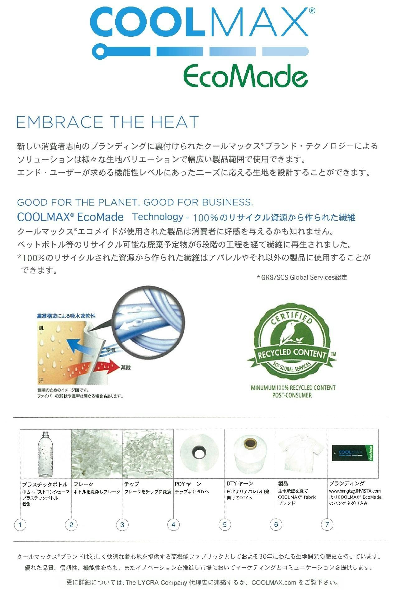 ・素材:ポリエステル100% (COOLMAX® EcoMadeファイバー50%)使用の交編裏メッシュ