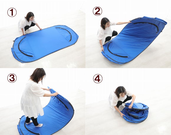①中の空気を抜きながら二つ折りにします。(出入り口のファスナーを少し開けると空気が抜けやすいです。)
