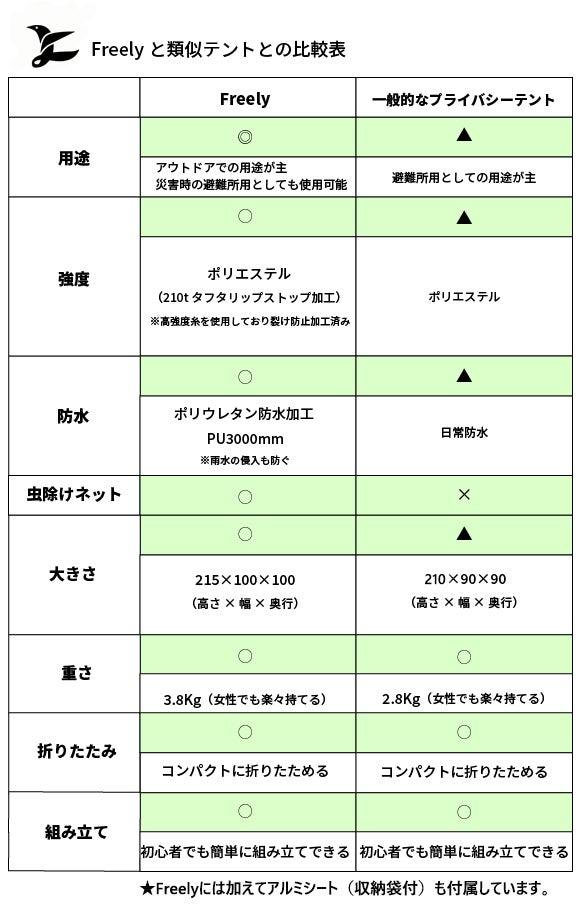 【Freely(フリーリー)】は、アウトドア使用を主目的としながらも、万一の災害時の避難所でもご使用いただけることを想定して開発されました。