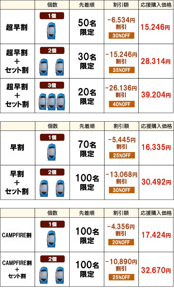製造スケジュールについては、現在プロジェクト成功を想定した数で調整しておりますが、想定を上回る応募購入の申し込みがあった場合、製造工程上の都合や配送作業に伴う止むを得ない事情によりお届けが遅れる場合が御座います。