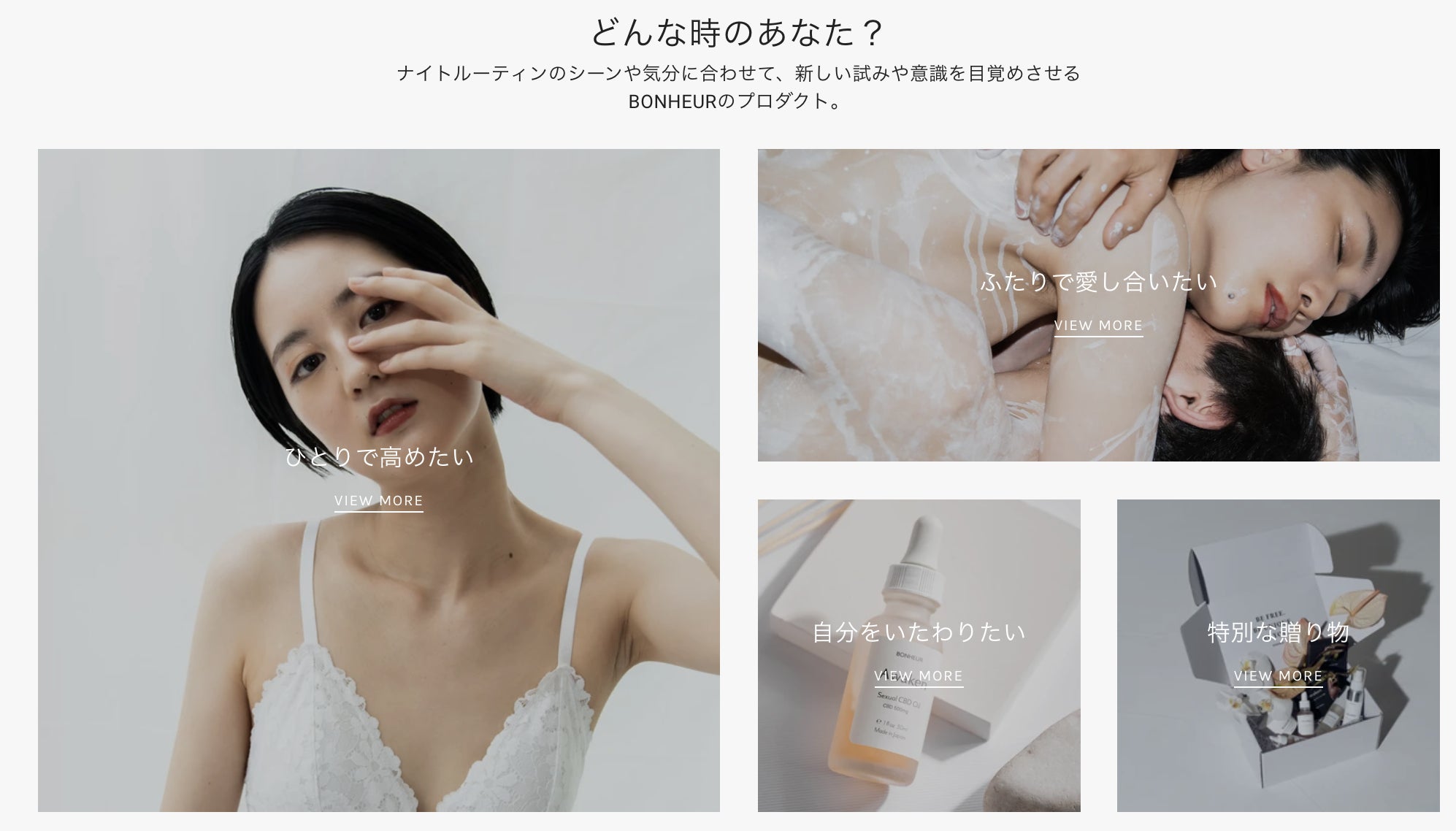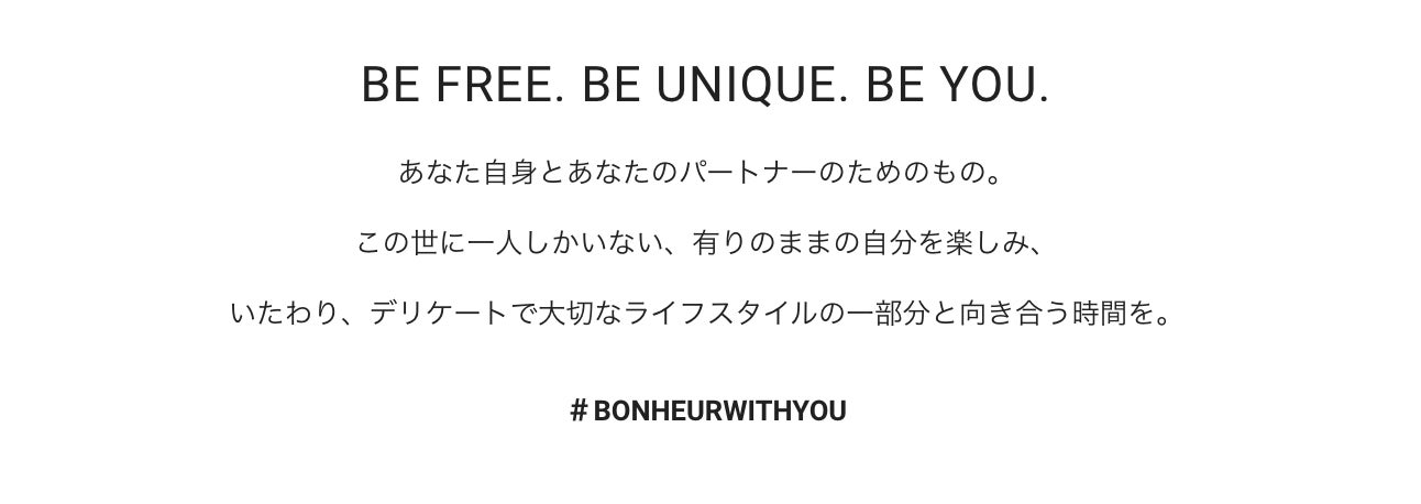 BONHEURは、日々の生活に寄り添い、ありのままの自分を受け入れられるよう、そして日常がほんの少し楽しく、特別な時間になるプロダクトを提案します。その時の気分に合わせて、生活の一部に取り入れることができるブランドとして、セクシャルウェルネスへのタブー意識に皆さんとともに改革を起こします。