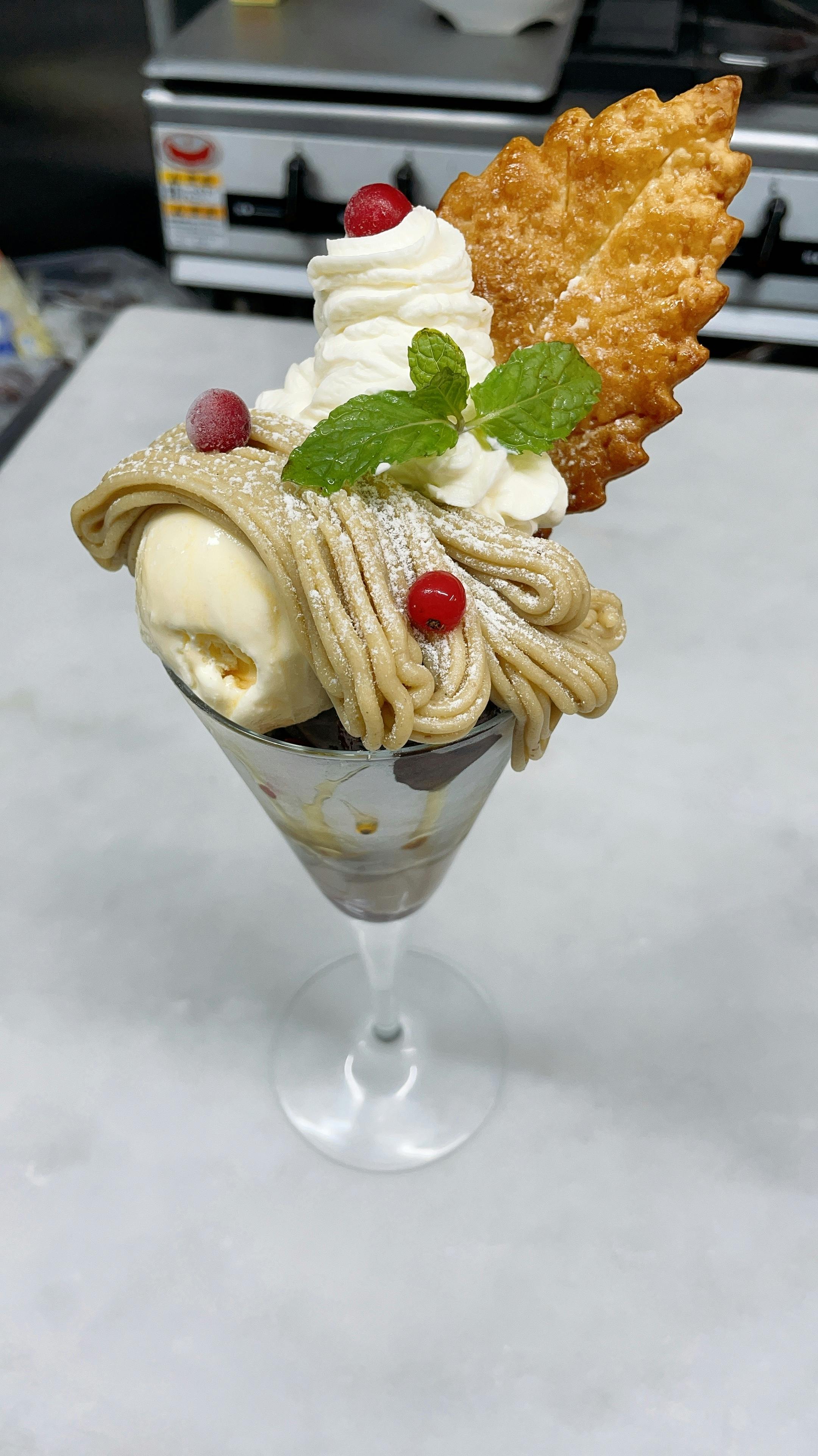 少し暑くなってきましたが、今日は天気が良くて気分もいいですね。当店は今期のかき氷を終わりにし、明日から少しずつ秋メニューを始めていくところです。まずは明日から店内限定でマロンクリームや和栗の甘露煮を使ったマロンパフェを始めます。期間限定、店内限定のメニューです。マロンパフェで味覚の秋…を堪能するのはいかがでしょうか。