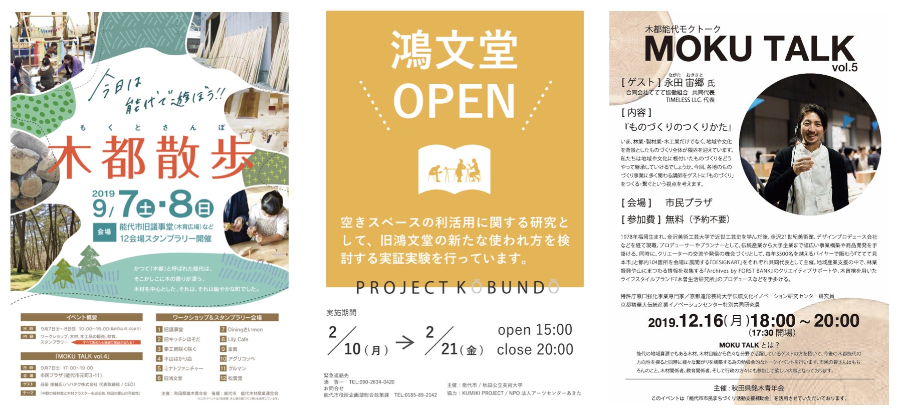 私は木に携わる仕事をしているので、木と街づくりを絡めたことができないかを常に考えてきました。木都能代を知らない人が大多数の能代。私自身も知らないことが沢山なので勉強するためにもと色々な仕掛けをしてきました。今街中は木都の面影も無いですが、昔は製材所、材木屋であふれていたそうです。すこしでも木都を感じてもらいたいと思い、既存店舗さんや空き店舗を活用して街全体を使って木を感じられるイベント「木都散歩」を開催したり、毎回木材目線から様々なゲストを招いて行っている「MOKU TALK」。能代市と秋田公立美術大学主催のもと、旧鴻文堂書店を利用して街中に高校生の場所を作るプロジェクト「PROJECT KOUBUNDO」では家具や床を高校生とともに貼ったりと、様々なイベントを開催してきました。今思うと、これら活動すべてがマルヒコから始まる街を元気にする動きに繋がっていたんだなと感じています。