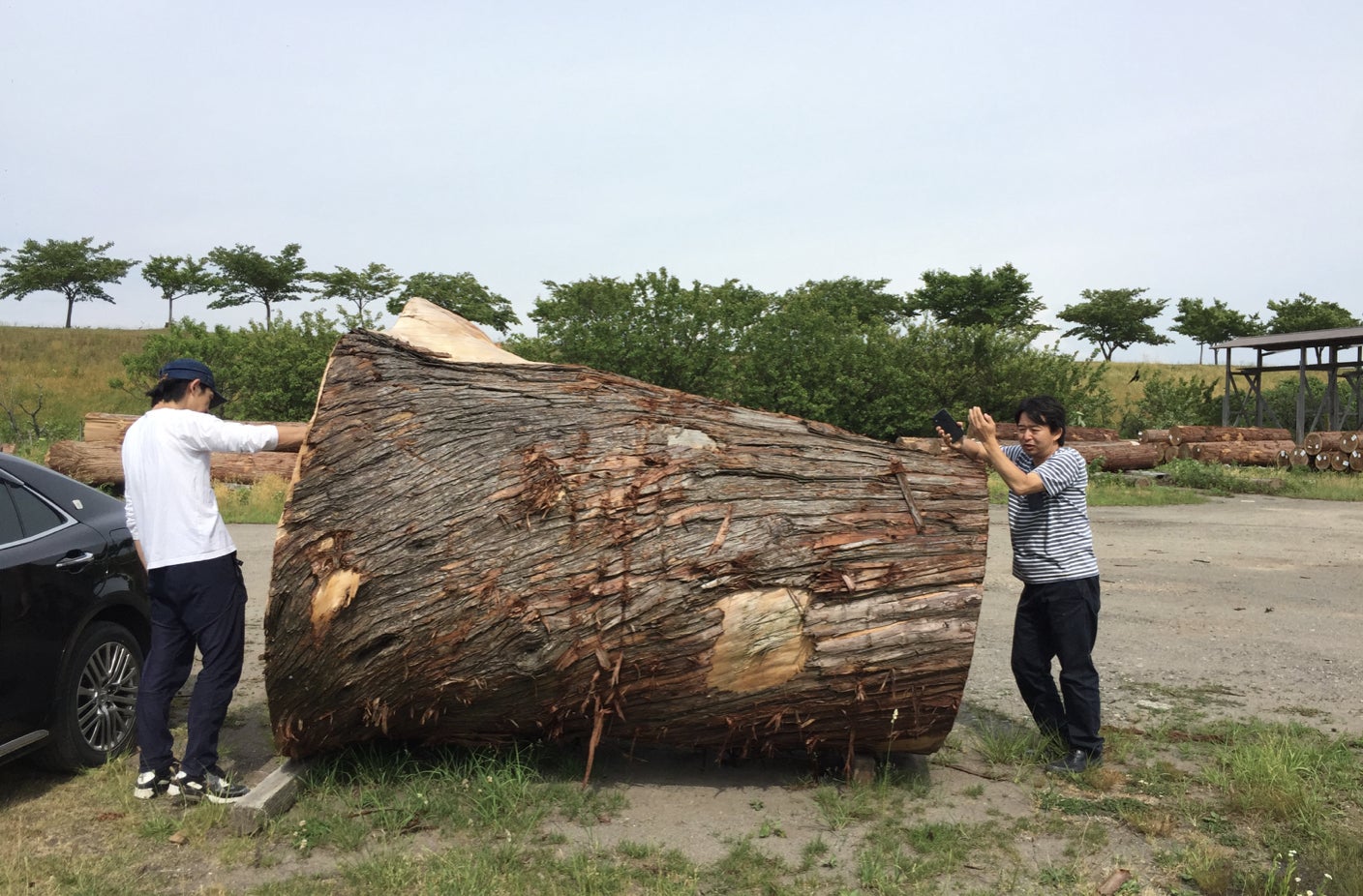 [ 製材屋さんへ行くと大木がゴロゴロと ]観光施設としては天然秋田杉の殿堂と称される国登録有形文化財「旧料亭金勇」があります。「満月の間」の長さ30尺の「中杢天井板」や大広間の「秋田杉全面杢四畳半仕切り格天井」は圧巻です。