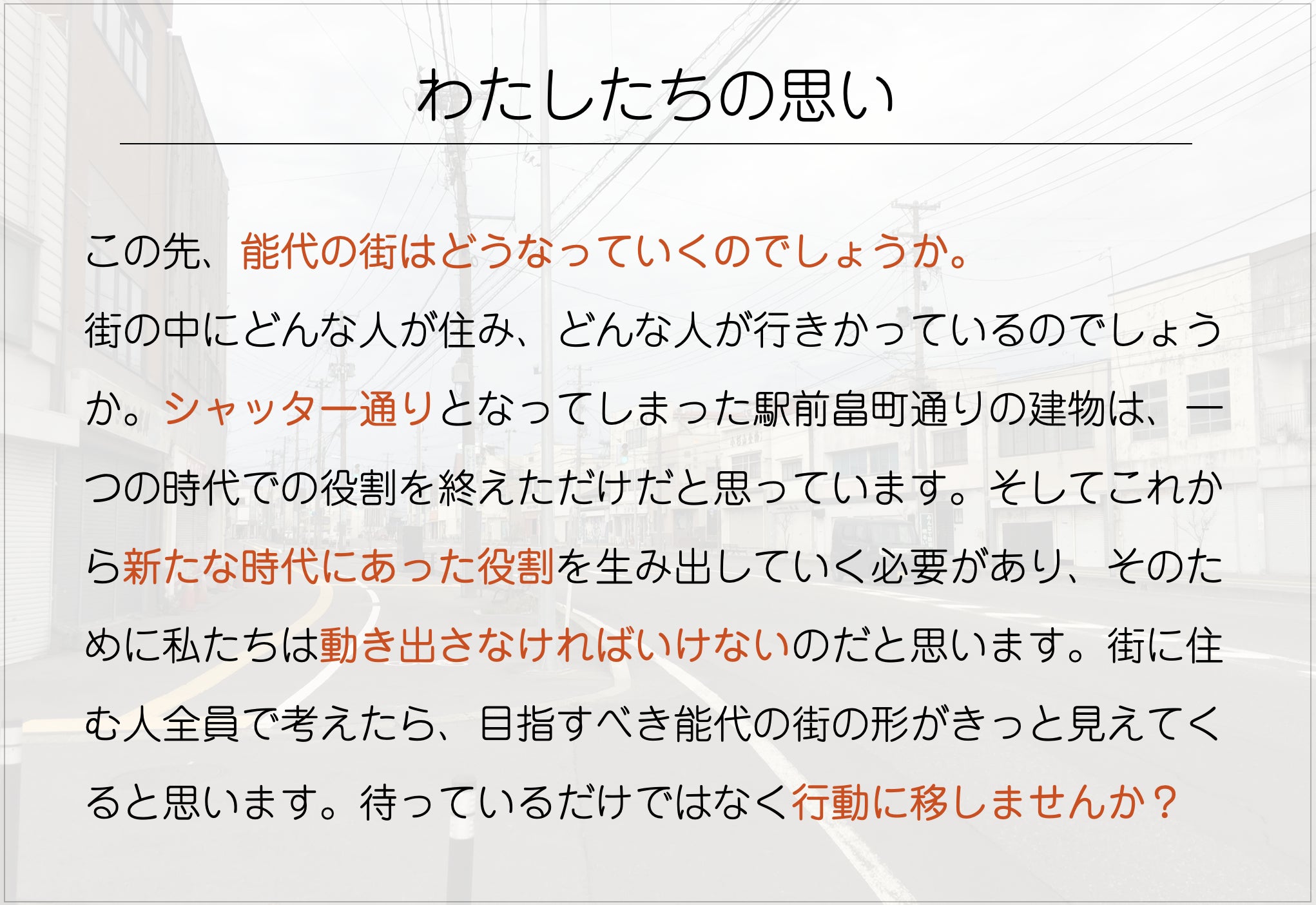 動き出す商店街プロジェクトが始まった初期段階からこの文言は言い続けてきました。他人事ではなく、自分ごととして能代の街を考えることが出来たらきっと街は変わっていくと思います。そして今は小さくともこの動きを少しづつ大きくしていきたい。もしこの思いが少しでも届くようでしたら何かしらの形で皆さんとご一緒できたらと思っています。みんなで動き出しましょう!