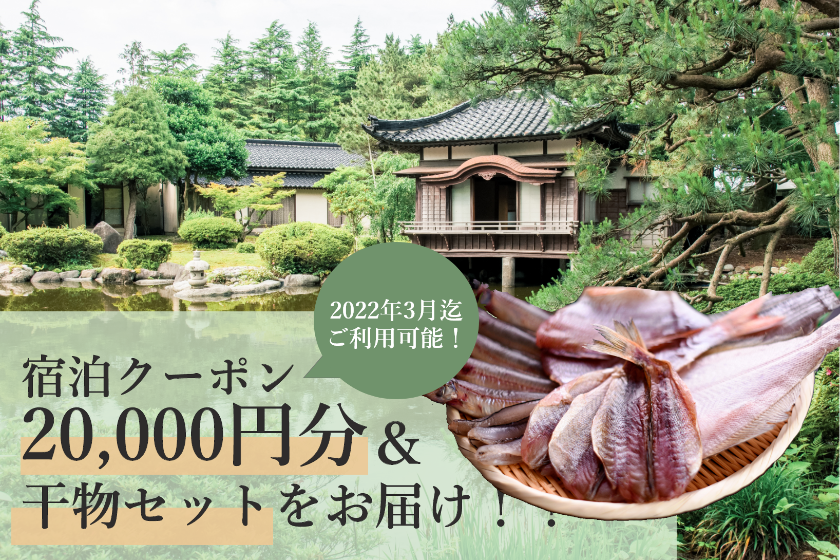20,000円分の宿泊クーポン&「干物の詰め合わせ(通常サイズ10尾程度)」をお届けします。