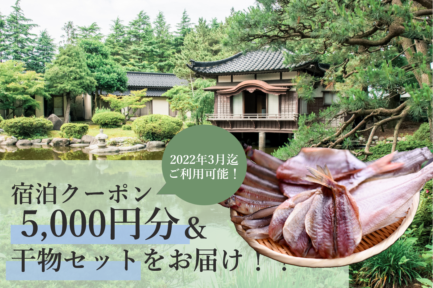 5,000円分の宿泊クーポン&「干物の詰め合わせ(通常サイズ10尾程度)」をお届けします。