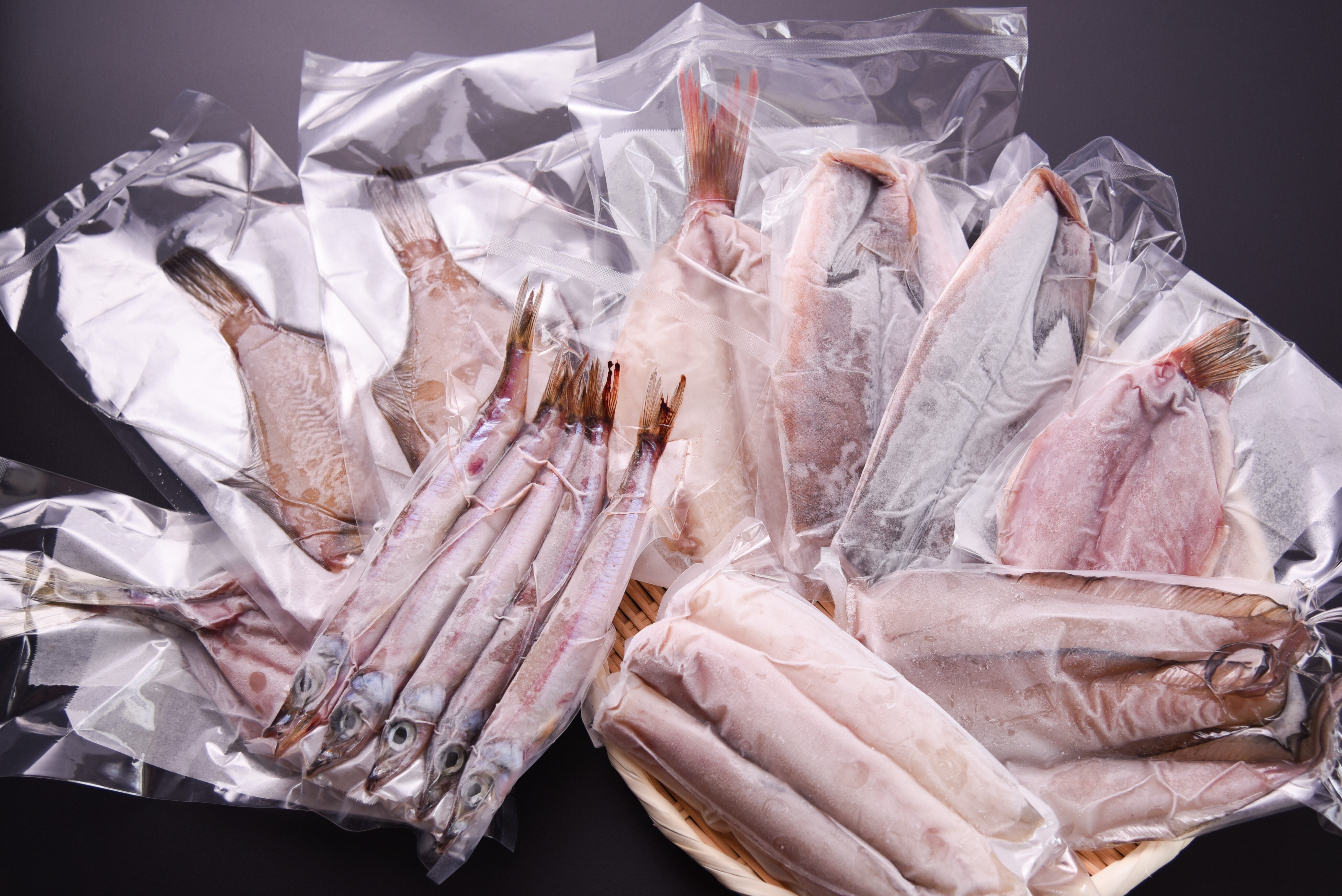 ↓重ねてパッキングしているので見づらいですが、20尾ほどの干物をお入れします。