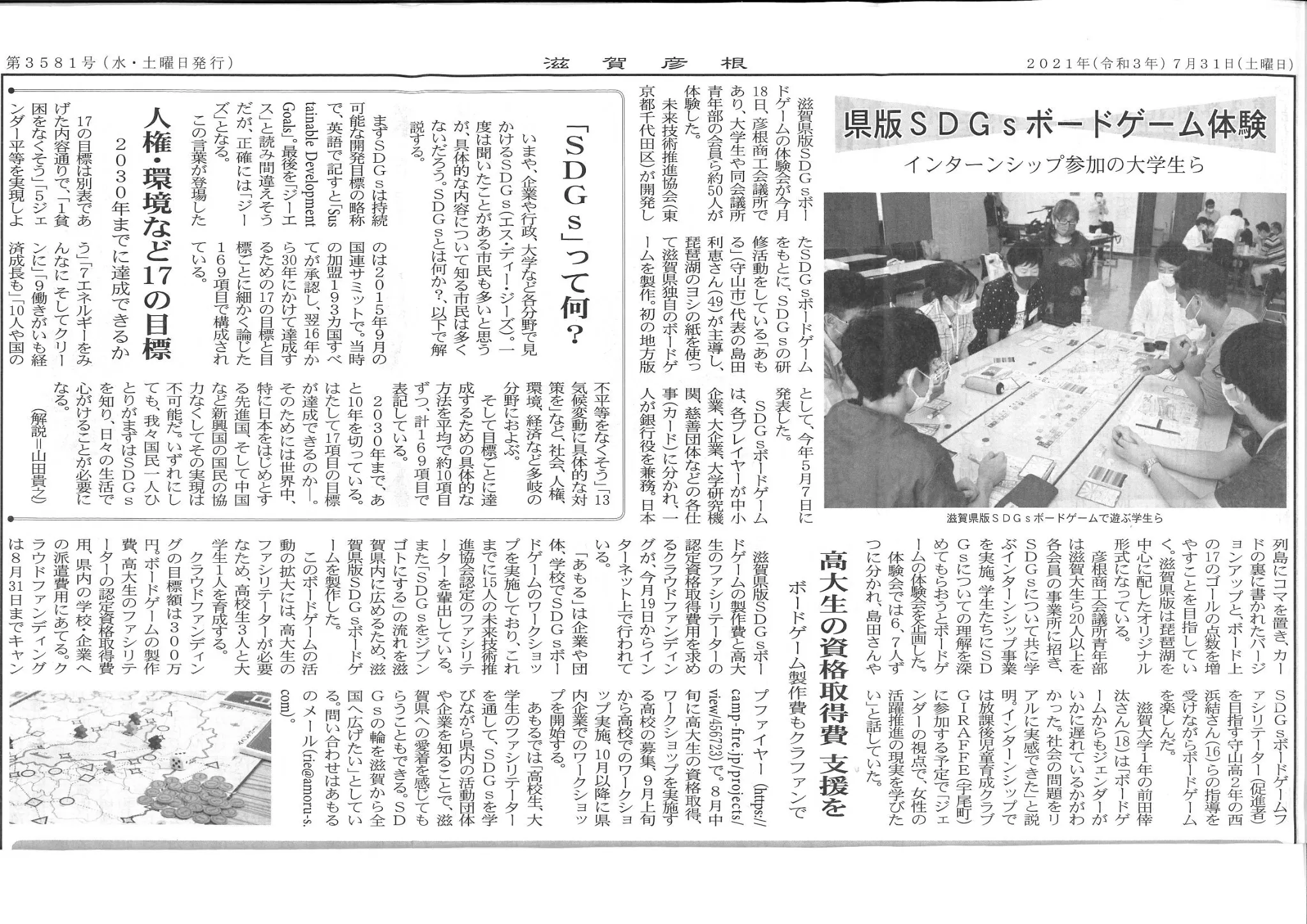 2021年 7月31日(土)掲載紙面にて、滋賀県版 SDGsボードゲームと学生ファシリテーター育成に向けたクラウドファンディングが取り上げられました!