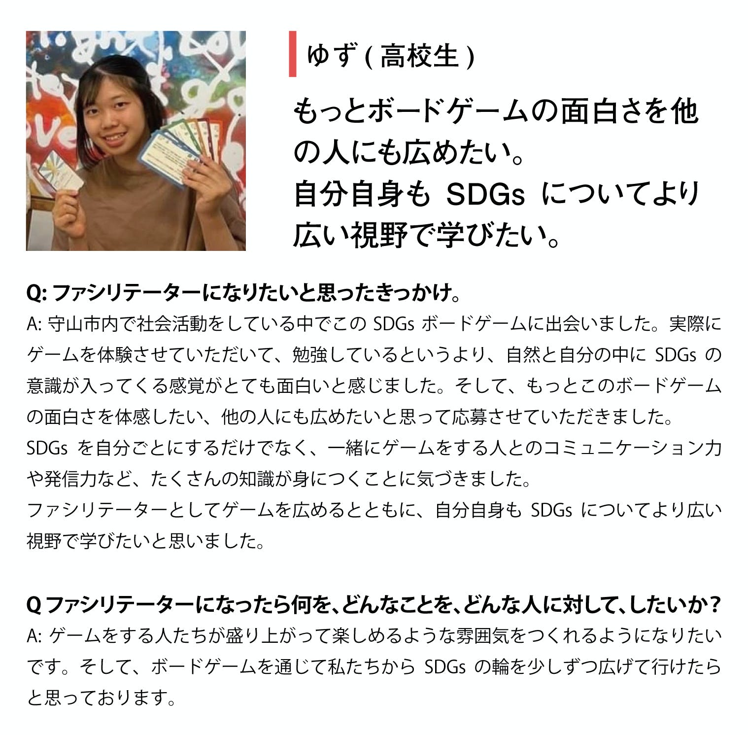 本プロジェクトでは「SDGsをジブンゴトにする」ワークショップを開催できる、高校生および大学生ファシリテーターを育成すること。さらには、滋賀県の活動団体や企業を知ることで滋賀県への愛着を感じながらSDGsを学んで、学校・企業での研修を行い滋賀県内での世代間交流の中心となり、SDGsの輪を滋賀県から全国へ広げていくことを目指しています。