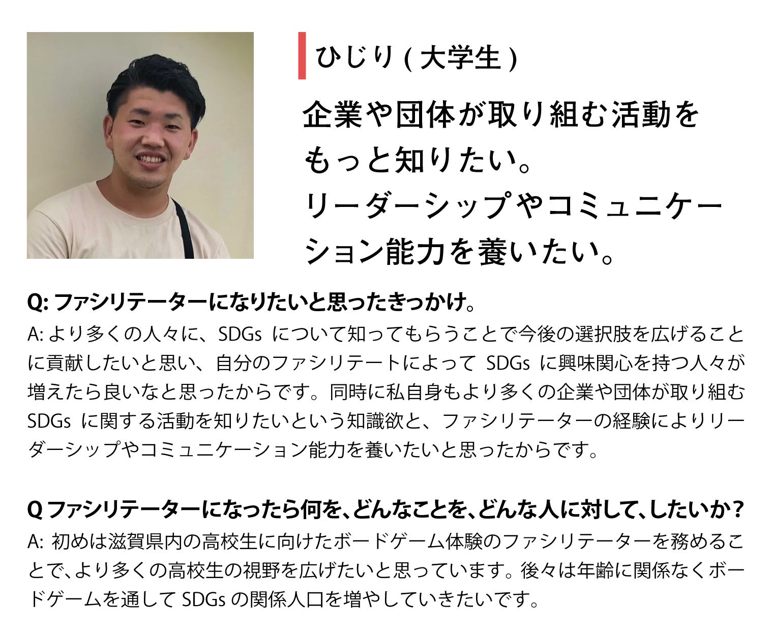 今回のプロジェクトは、滋賀県におけるSDGs活動を、学生から推進していくためのプロジェクトです。 ボードゲームを通じて、学生が自分が住む滋賀県の事例を学び、ファシリテーターとして発信していくことを目的としています。