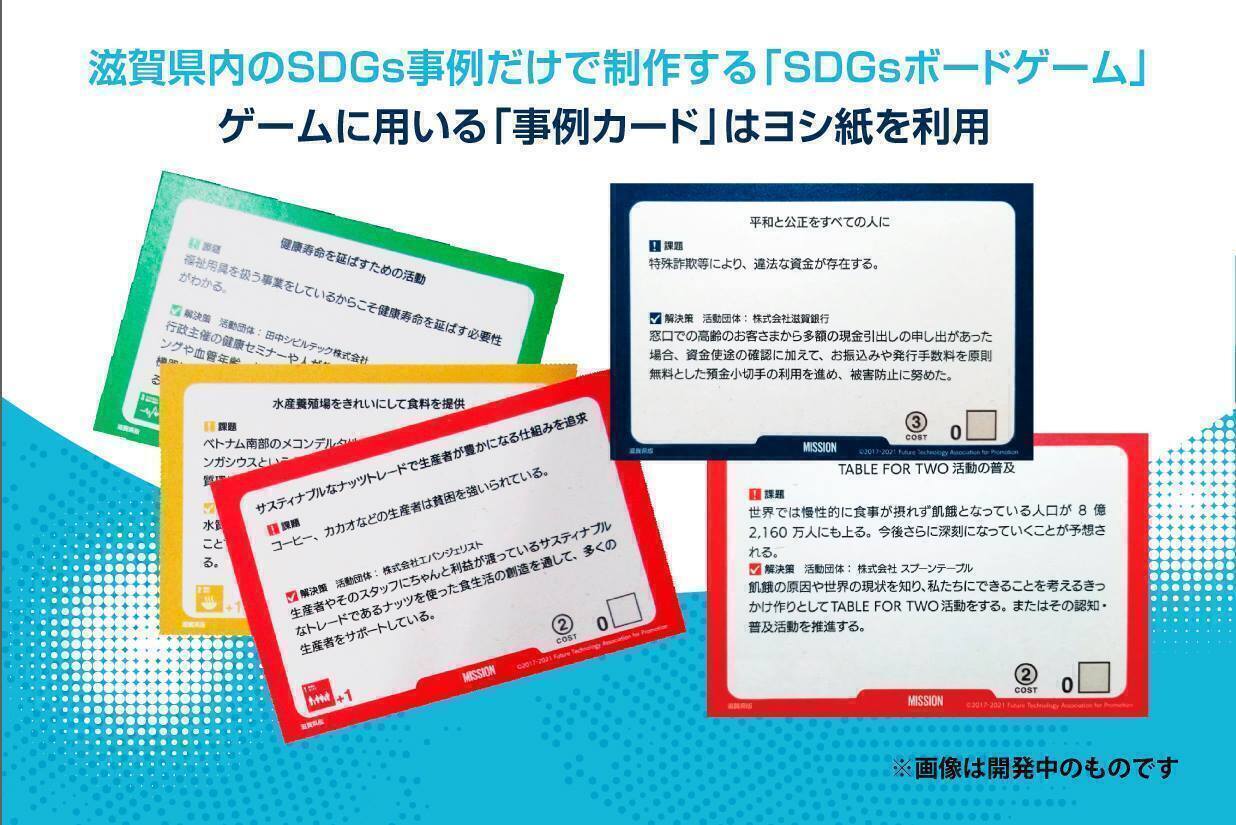 そんな滋賀県から「地方」「企業」「SDGs」の発信を目指して、身近な事例を題材に展開したいという関係者の熱い思いの詰まったボードゲームを、SDGsボードゲームふるさと版の第一号として制作しました。