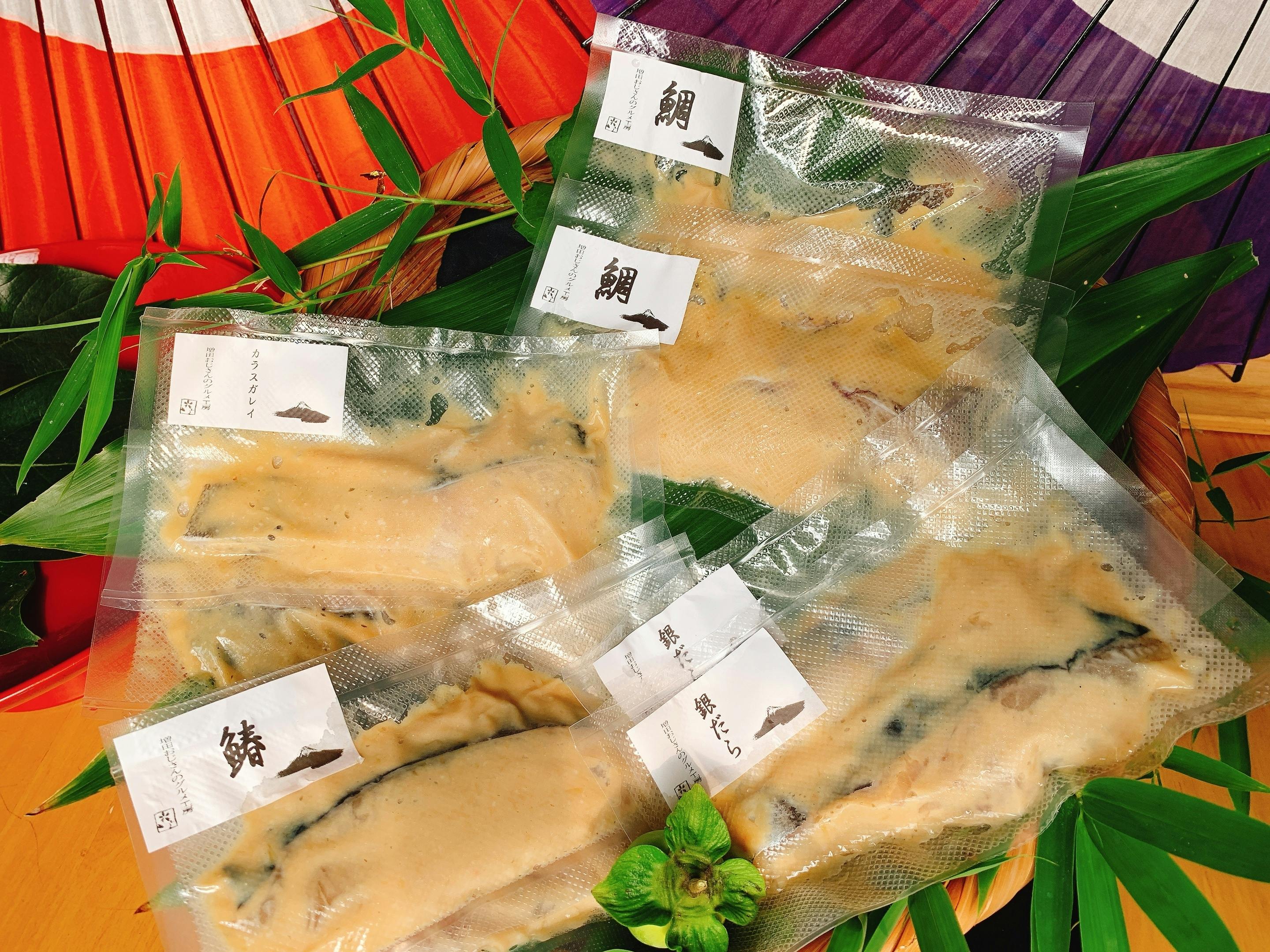 旬の魚や脂の多く乗った魚にこだわり、臭み無く、骨を丁寧に抜き、手作りの西京味噌の風味をしっかり一週間漬け込み、中まで甘みが感じられる、一つ一つ手作業で作った西京漬です。食べたらわかると思います。今までの西京漬と比べてみてください。魚の種類にもよりますが2日3日では味は表面しか味噌の味がつかないものも多く、甘みも少ないので是非この機会に私の西京漬を食べてみて頂きたいです。