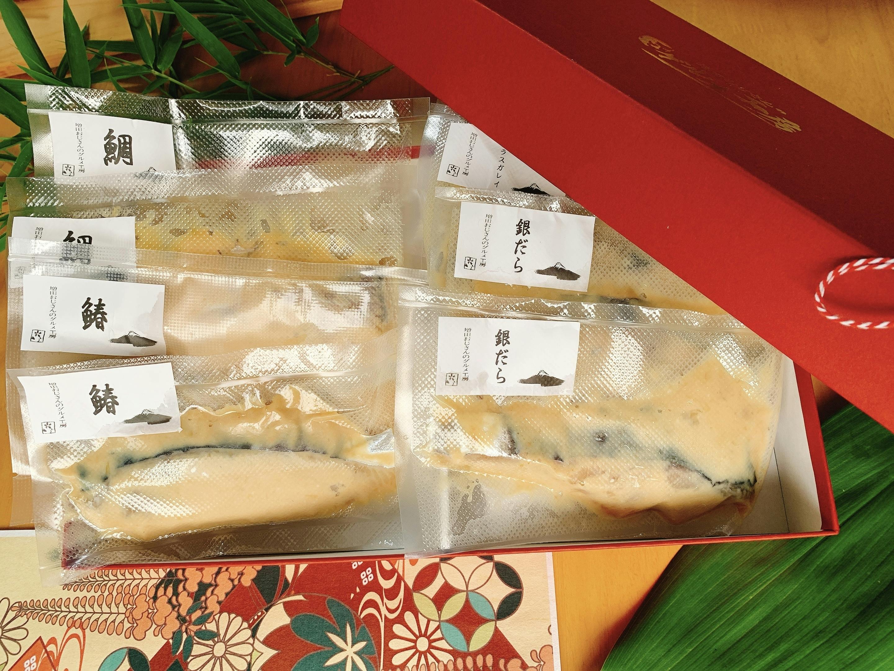 今回はギフトボックスに【鰆、鯛、銀ダラ、カラスガレイ】の4種2切れ入 計8切れを詰めて発送致します。