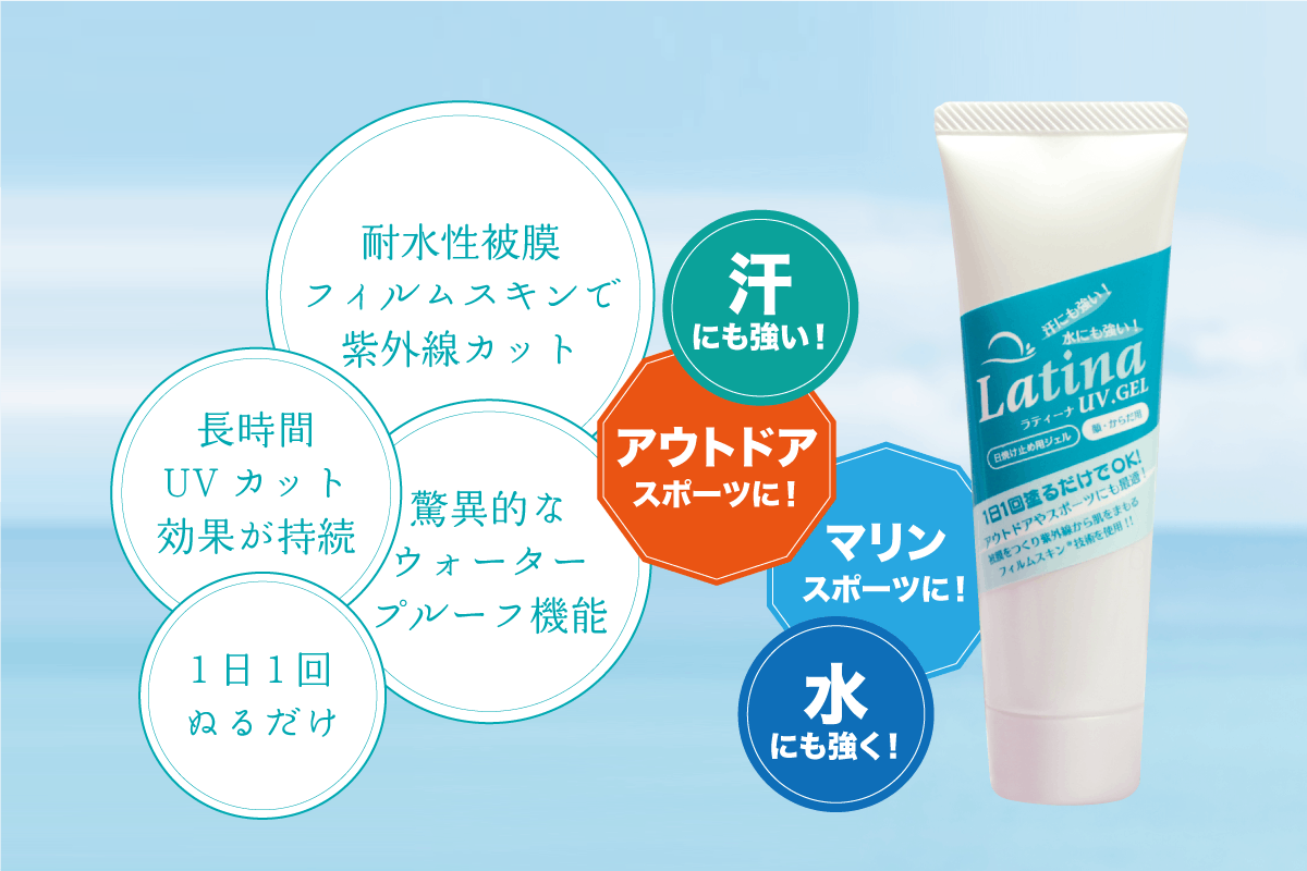 既存の日焼け止め商品は水や汗で何度も落ちるため、何度も塗り直しが必要ですが、ラティーナUVジェルは1度塗ると長時間有効です、その為何度も塗り直しの必要がありません。また、オイルを使用していないのでベトベトしないのと、プールでも使用できます。