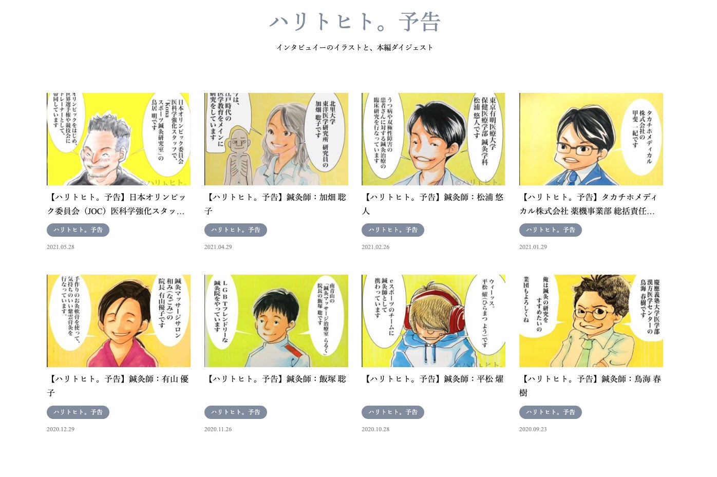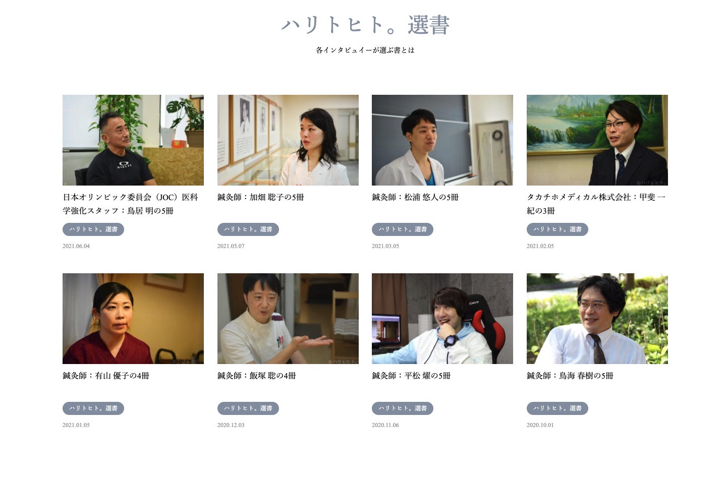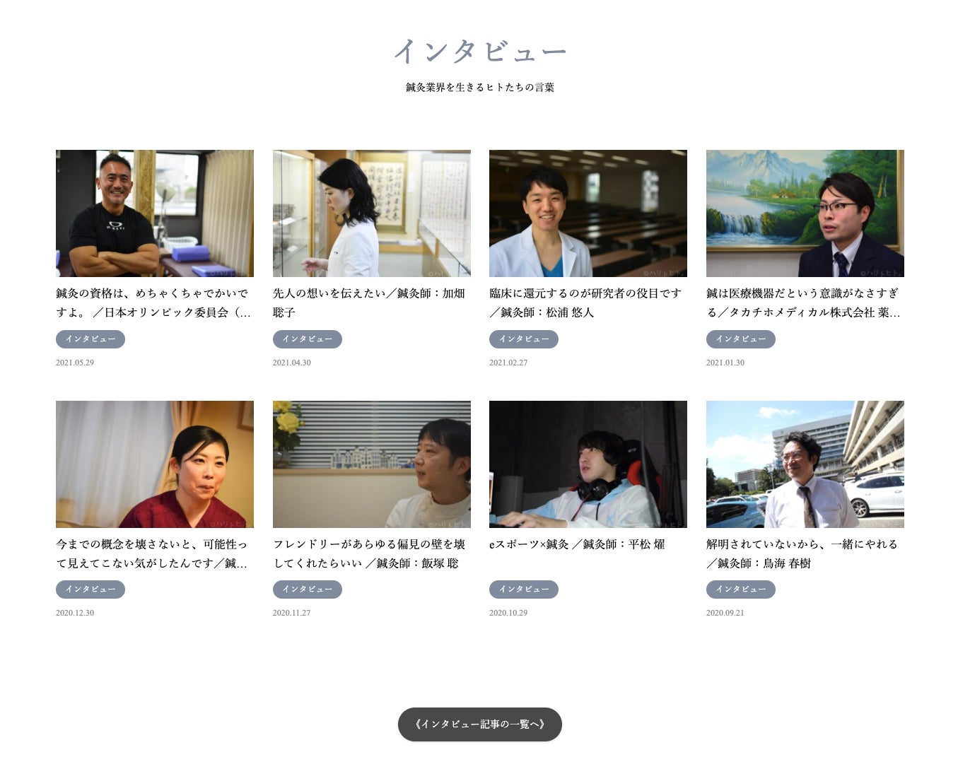 ハリトヒト。にアクセスすると、鍼灸業界のヒトたちのチャーミングで味わい深い、実体験に基づいたインタビューが並んでいます。