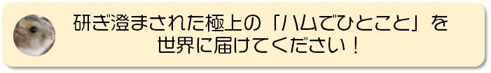 「20字以下」というとてもストイックなルールゆえ、ひねり出された「ハムでひとこと」は、ハム愛に溢れた極上の作品となると信じています!この極上の作品をみんなで楽しみ、みんなで笑顔になる!これがこのチャレンジの目指すところであります!