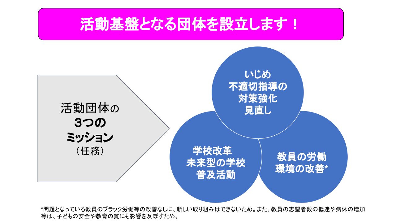 本プロジェクトによって設立する団体は、この「子どもの権利条約」を軸とし、より良い教育環境が整備されていくよう、活動していく所存です。