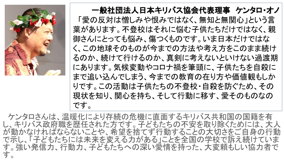 しかし今、私個人として海外の協力をしている場合ではないと思うほど、日本の子どもたちを取り巻く環境、教育現場に強い危機感を抱いています。いじめ認知数や不登校数、10代の自殺件数が年々増加し、しかも低年齢化しているという事実は、きわめて深刻な社会問題です。