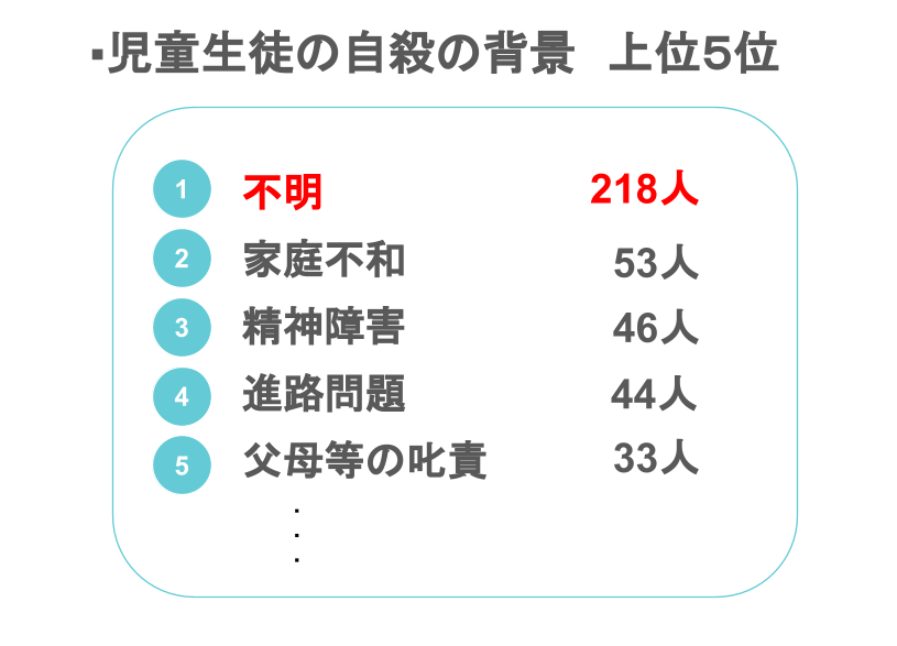 自殺の環境の1位「不明」の影の要因も、こういうところからくる無気力や不安である可能性も否定できません。