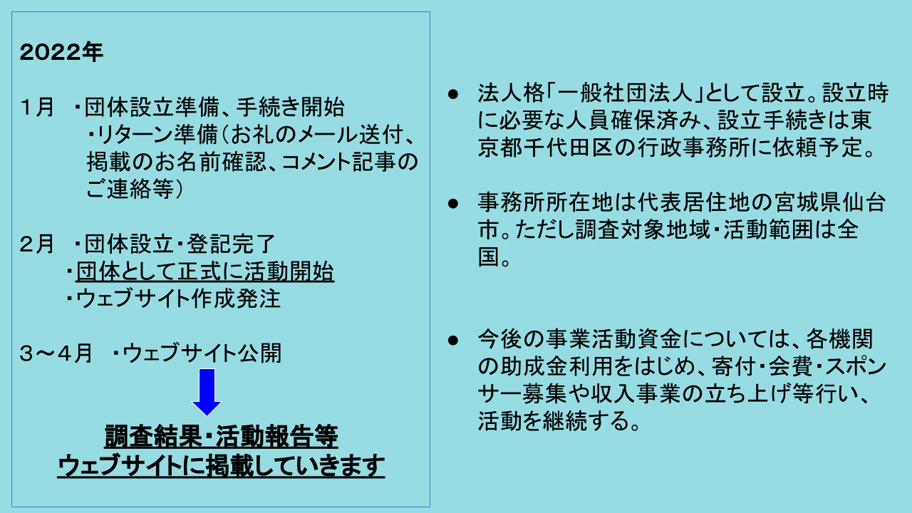ご支援いただいた方には、お礼のメール、お名前掲載、活動報告メール、設立報告会へのご招待、ウェブサイトへのコメント記事掲載等を考えております。詳細はリターン欄をご覧ください。(お名前およびコメント記事の掲載など、リターンをご希望されない場合はご辞退も可能です。備考欄へのご記入にてお知らせください。)