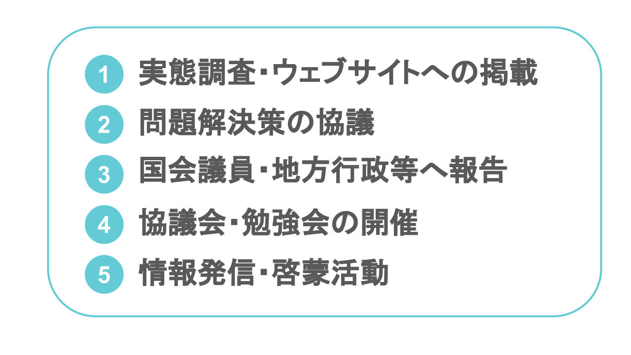 協議でまとめた要望書や調査で収集した実態情報等を、国会議員や地方行政に報告・提出し、問題解決のための協力を求めていきます。