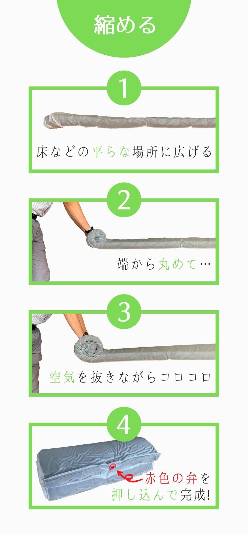 丸めた際に空気弁を閉めれば、形が保たれるので紐やバンドも不要です。