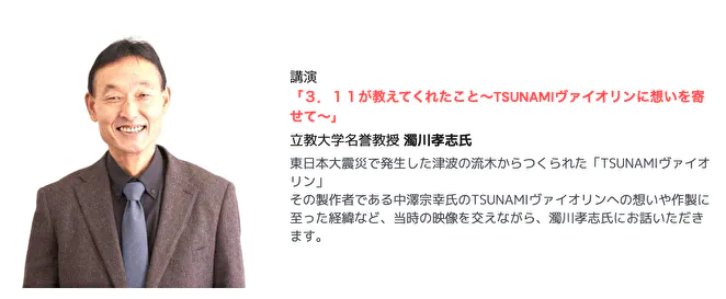 その中で、「千の音色で繋ぐ絆プロジェクト」の一環としてTSUNAMIヴァイオリンの演奏も取り入れます。